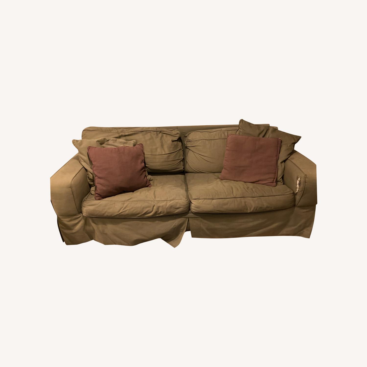 Seller's Notes:We are remodeling and unfortunately couch has to go. Still super comfy, admittedly with some wear and tear over the years. (See pictures.) easily fits 2 adults and 2 kids for reading, movie night, etc. One back cushion stitching is coming loose (see photo), but could be sewn back by someone who knows how.