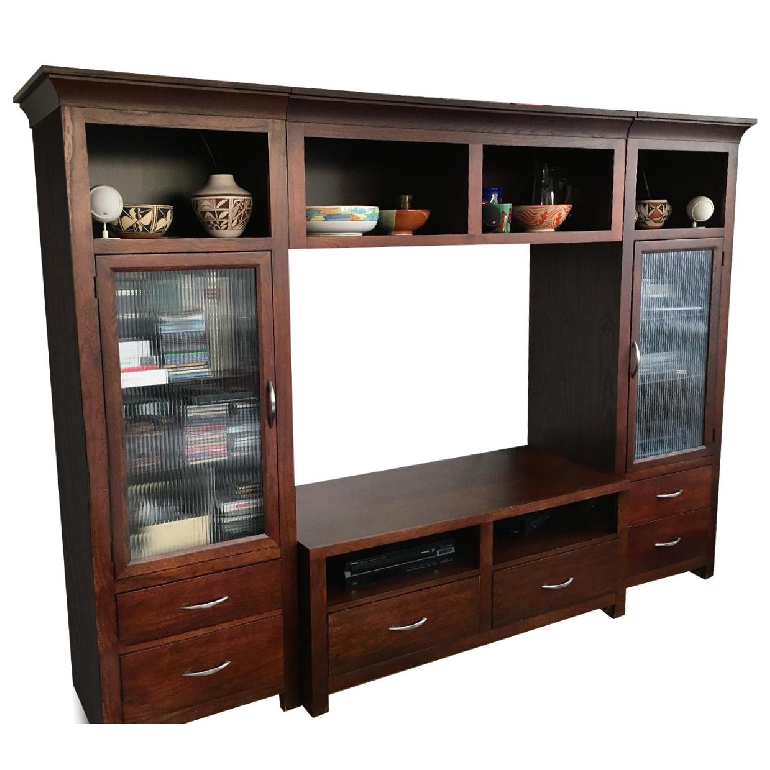 Seller's Notes:Large entertainment center with ample storage. Bridge piece across top of unit has built in lighting for display cabinets. Purchased from Jordan's Furniture Feb 2006. They describe color as "Merlot" . Overall dimensions as noted above, but here are individual components: Media base is 54" length X 24" depth X 22 in height Each audio cabinet that flanks the media base is 26 " length, 76 " height, and 22 inch depth and has ridged glass doors with inside shelves. Light bridge across top - 54" length, 18" height and 22" depth. Only damage is some scrapes on legs (example in picture) and one ding on the media base, also shown in picture,