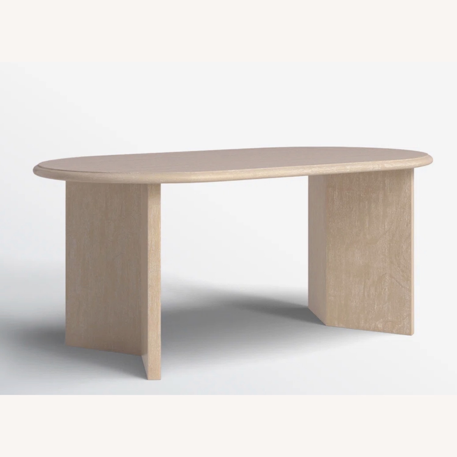 Rounded edges, angular sled legs, and a smooth finish make this dining table a minimalist must-have for all occasions. Whether creating a monochromatic color palette or investing in a welcoming spot for get-togethers, it's the perfect pick to suit your needs. It's crafted from solid mango and engineered wood, and it rests on a double pedestal base for lots of durability and support. Measuring 72" wide, the oval table top can comfortably accommodate up to six people.