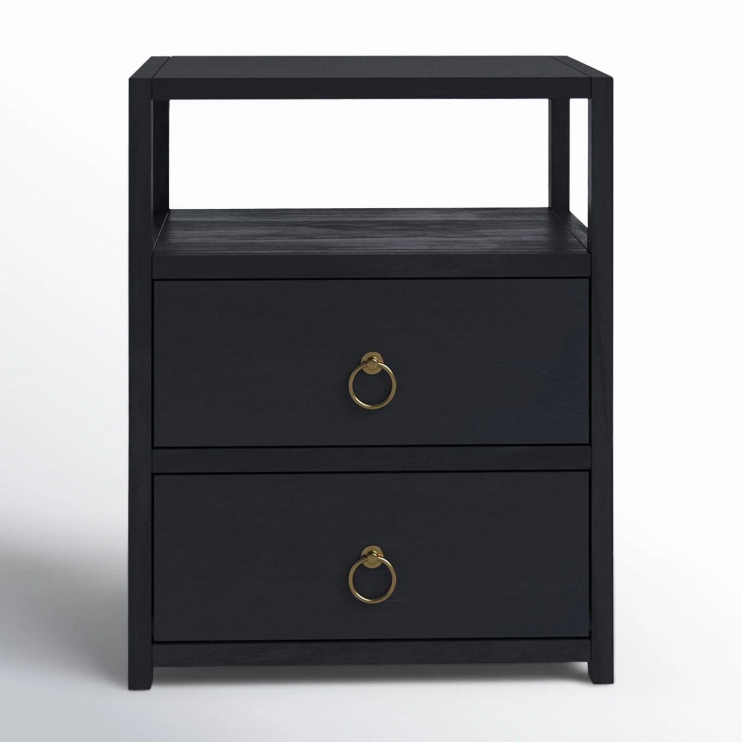 This nightstand is ready to mix and match in your bedroom thanks to its streamlined design and array of finish options. Two drawers keep nightly must-haves close by, while the open shelf lets you stack must-reads. Gleaming ring-shaped hardware complements this bedside table's wooden frame, and the rings are removable for optional customization.