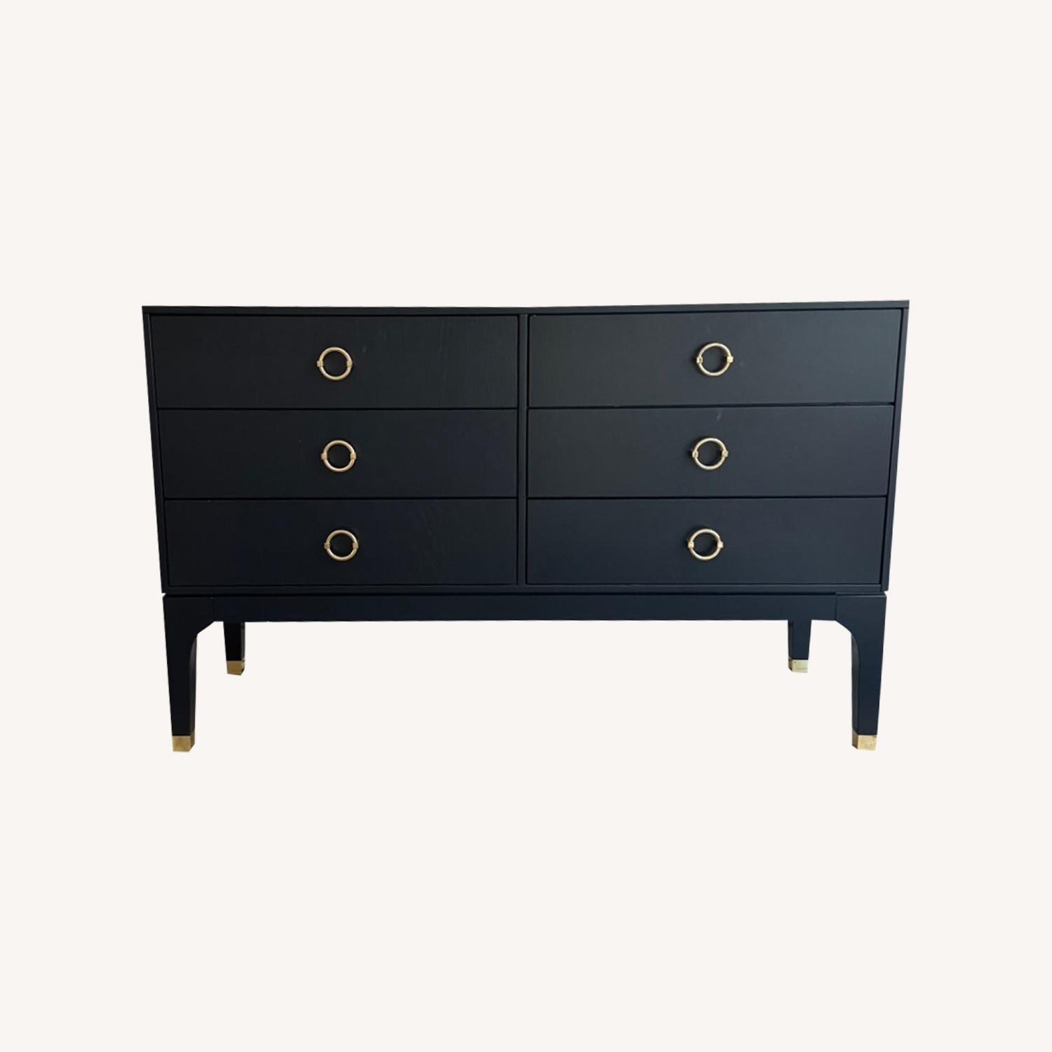 Seller's Notes:This is a lightly used dresser that just doesn’t fit our vibe. No noticeable blemishes. Navy lacquered wood with gold hardware accents and velvet-lined drawers.