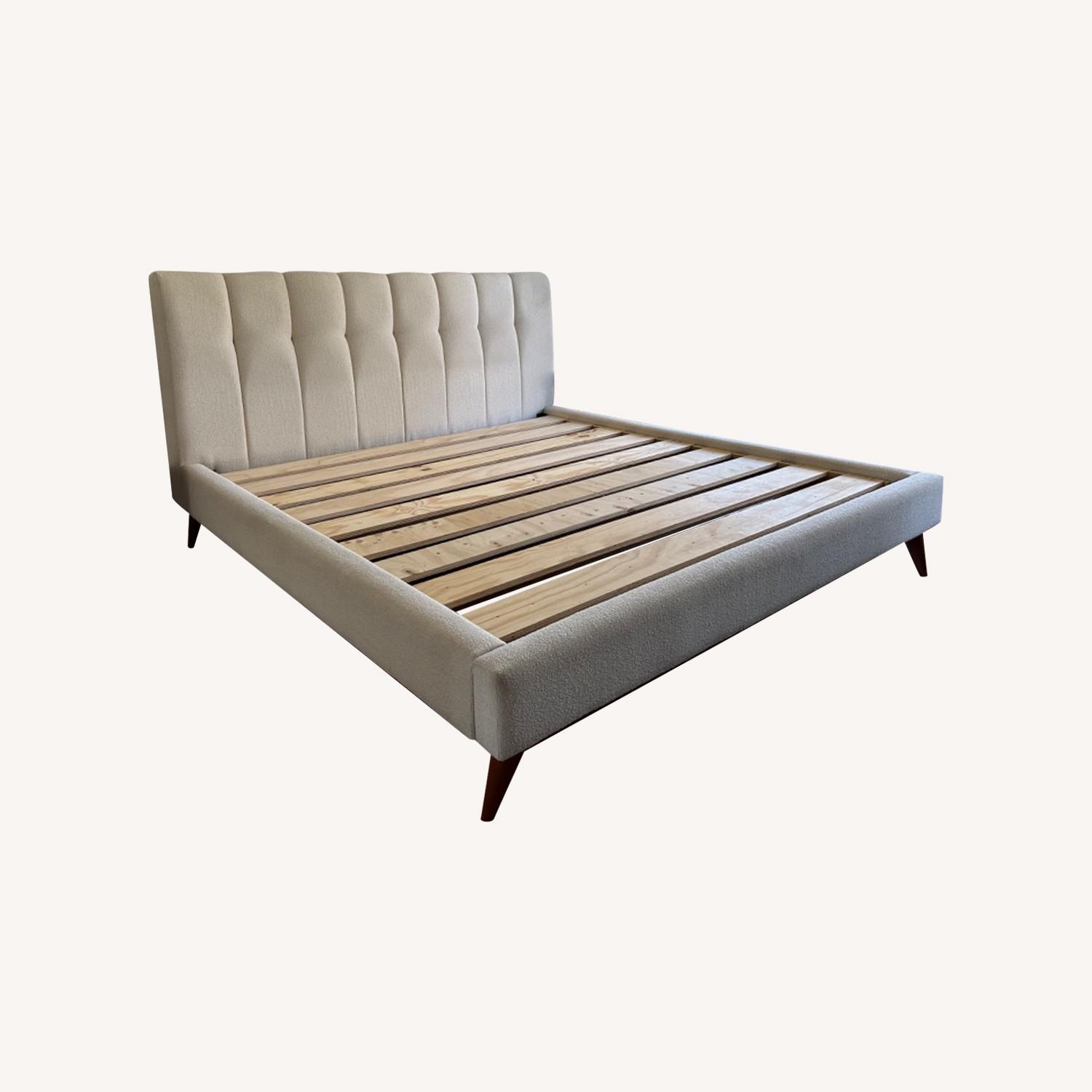 Seller's Notes:Joybird Hughes Bed Frame for Sale Size: King Fabric: Tussah Snow Wood Stain: Medium Location: Brooklyn, NY PICK-UP ONLY