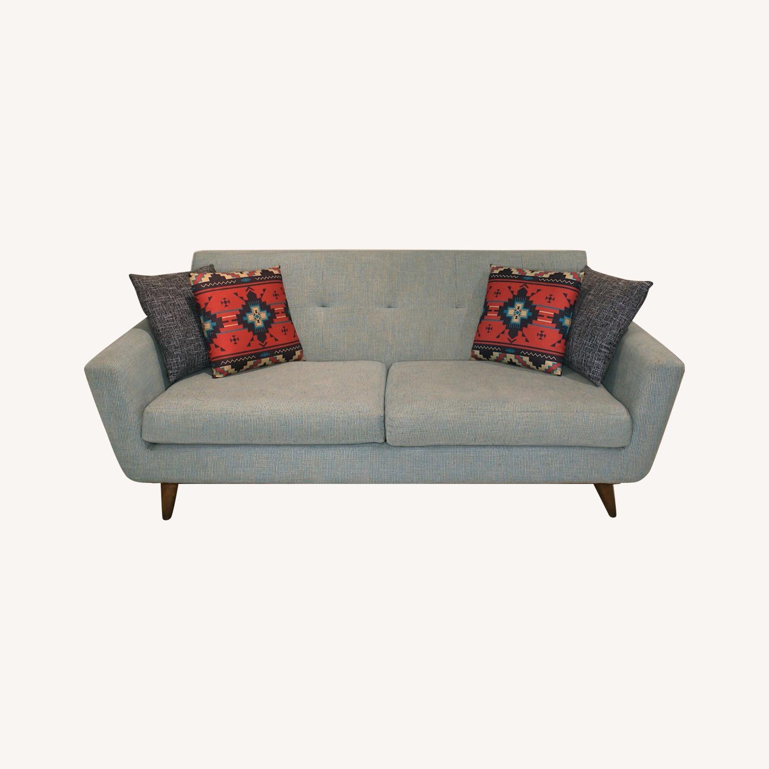Seller's Notes:Mid-century modern loveseat for sale. Base and legs are walnut and cushions are a light blue textured fabric. Seating: 65" x 25" x 18" Arm Height: 7" x 25" Legs: 6" The legs are detachable (screw-in) which makes moving easier. Otherwise, a solid piece of furniture that retailed for $2K when I bought it a few years ago. Loveseat is in excellent condition, with only the slightest discoloration on the arm rests, with no nicks and minimal piling of the fabric. It's also quite comfortable, cozy enough to sleep on. The frame is kiln dried hardwood ad the cushions are high density polyurethane foam with layers of fiber. Contains no flame retardants or harmful chemicals.