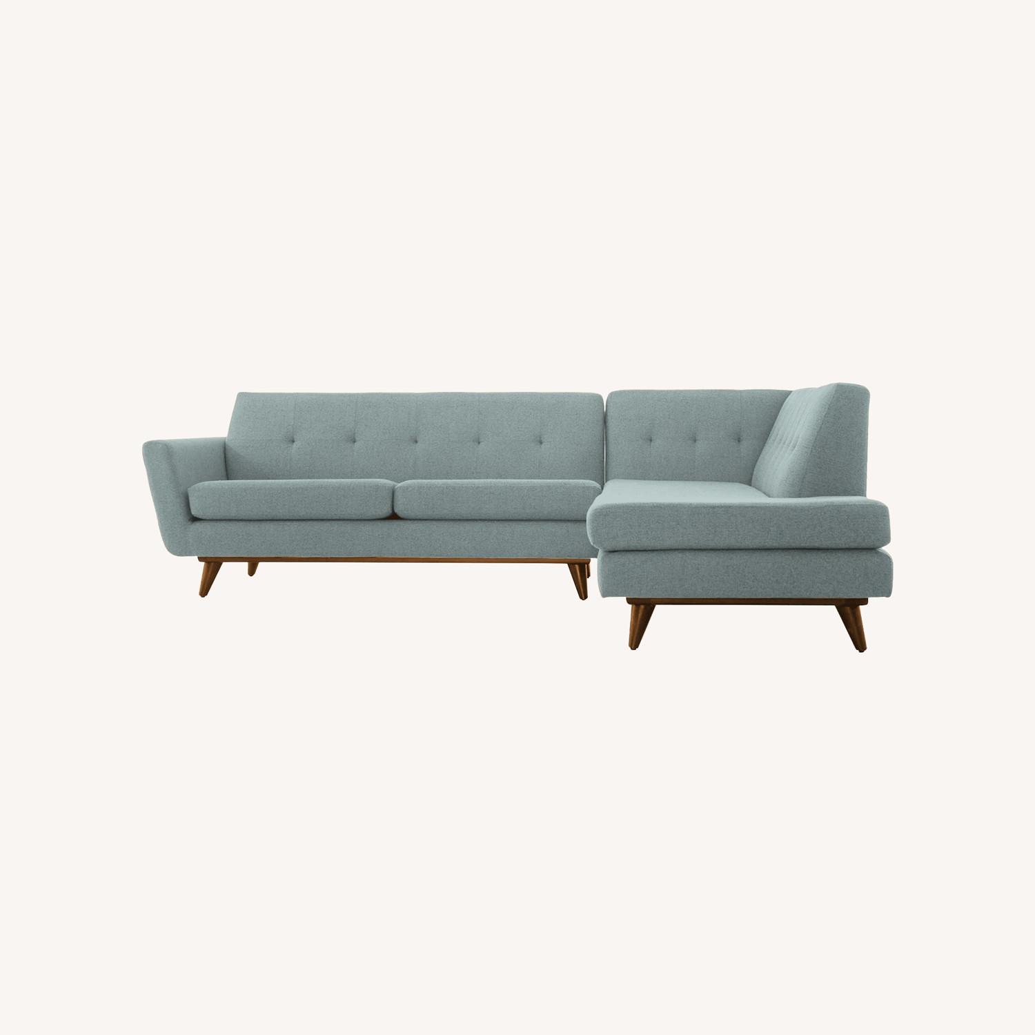 Seller's Notes:Joybird Hughes Sectional with Bumper (2 piece) that has Sunbrella Premier Sea - Wood fabric, a mocha wood stain and is oriented right. Soft angles and a clean silhouette meet classic styling and comfort in this family-friendly sectional. From its simple retro lines and dreamy Mid-century vibe to the quality handcraftsmanship, Hughes is a sectional designed to give you everything you want out of a piece of furniture. There are endless ways to design your room around this sectional, or vice versa. Start with the upholstery and wood stain choices—with so many possible combinations, you’re guaranteed a true one-of-a-kind piece.