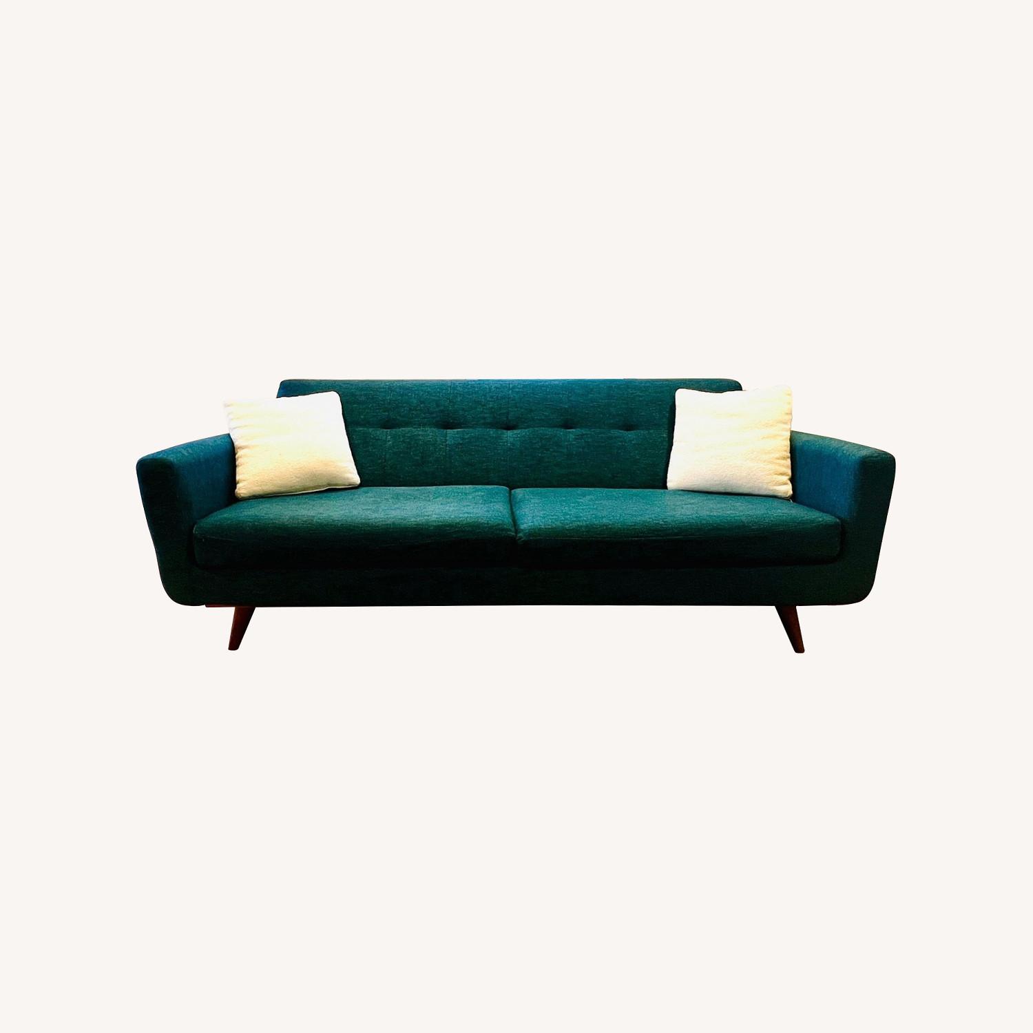 Seller's Notes:Joybird Hughes Sofa in Largo Zenith Teal with medium wood stain legs. Custom built in November 2020. Includes two white accent pillows and 2 extra seat cushions. In excellent condition. This is a looker! It’s just gotten too small for our family.