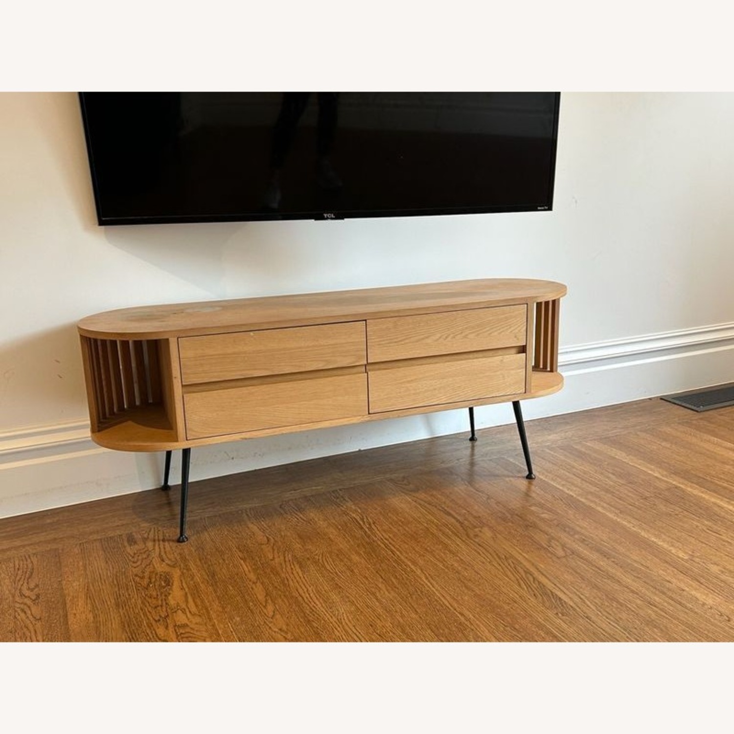 Seller's Notes:Two door Mid-Century style cabinet with open corner shelving and metal legs