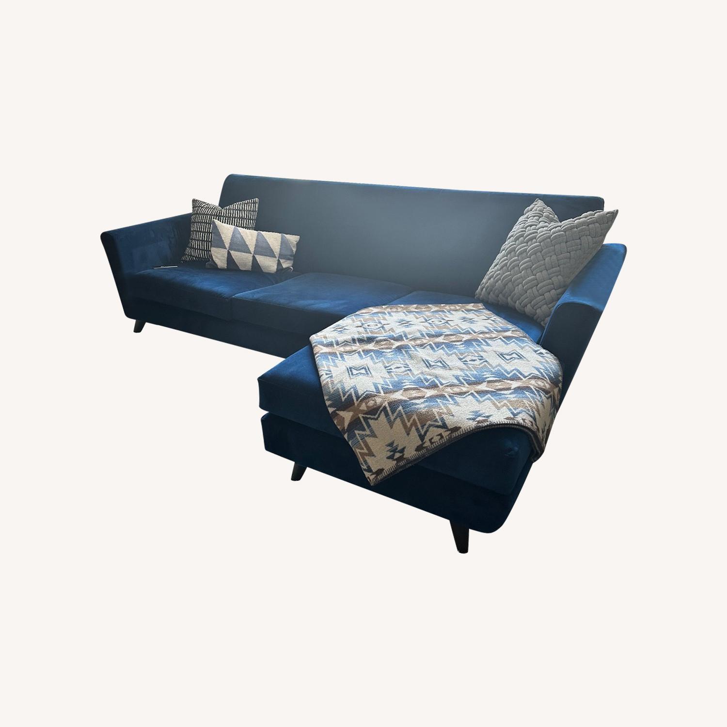 Seller's Notes:In new condition, no blemishes. Sofa is in a velvet blue fabric and lived in a home with no children or pets. Reversible chaise/ottoman.