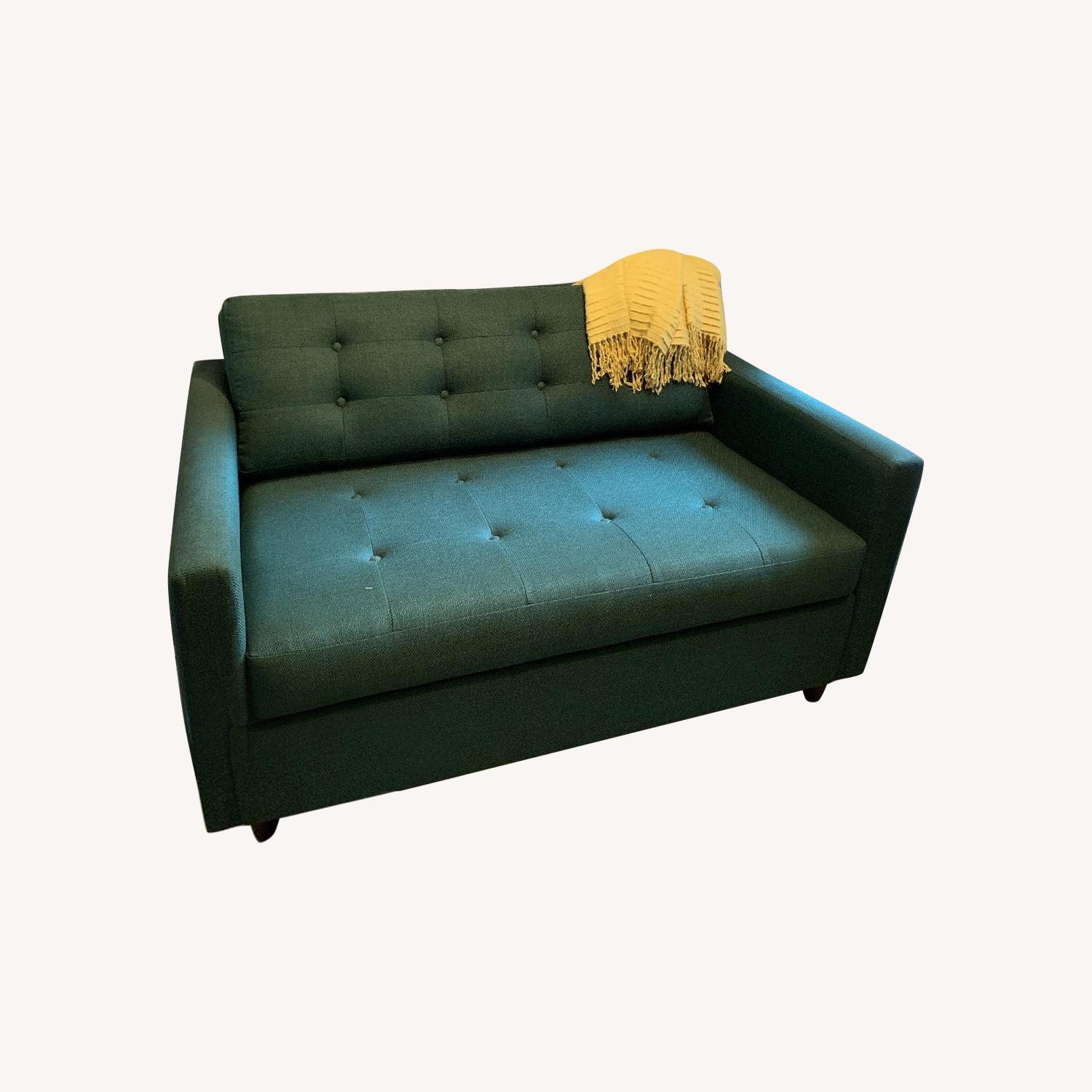 Seller's Notes:We purchased this twin sleeper from JoyBird in 2018 for $1,039. Since that time it's been sitting in our second bedroom unused. It's only been sat on a few times, and only slept used as a bed once! Details: Fabric: Tess Evergreen Wood Stain: Mocha Bed: memory foam Size: 51"w x 35"d x 33"h