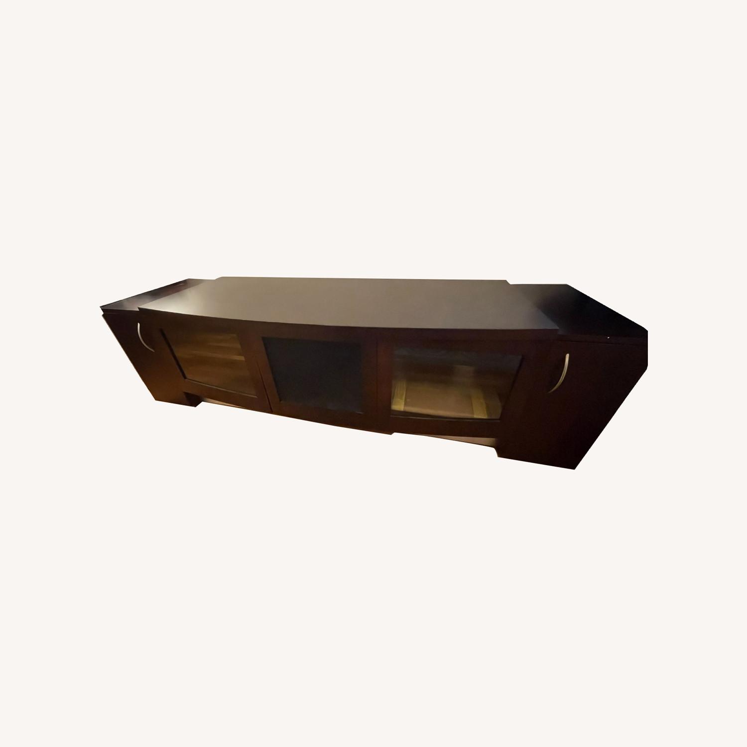 Seller's Notes:Massive entertainment center/ TV console being sold at a huge discount! Made of solid birch wood and wood veneer. Features: - speaker grill door (with interchangeable tempered glass panel in original packaging) - removable back panel - convection ventilation -levelers in the feet - adjustable shelves - two 1/2 inch interior wire access holes Minor scratches of finishing at edges.