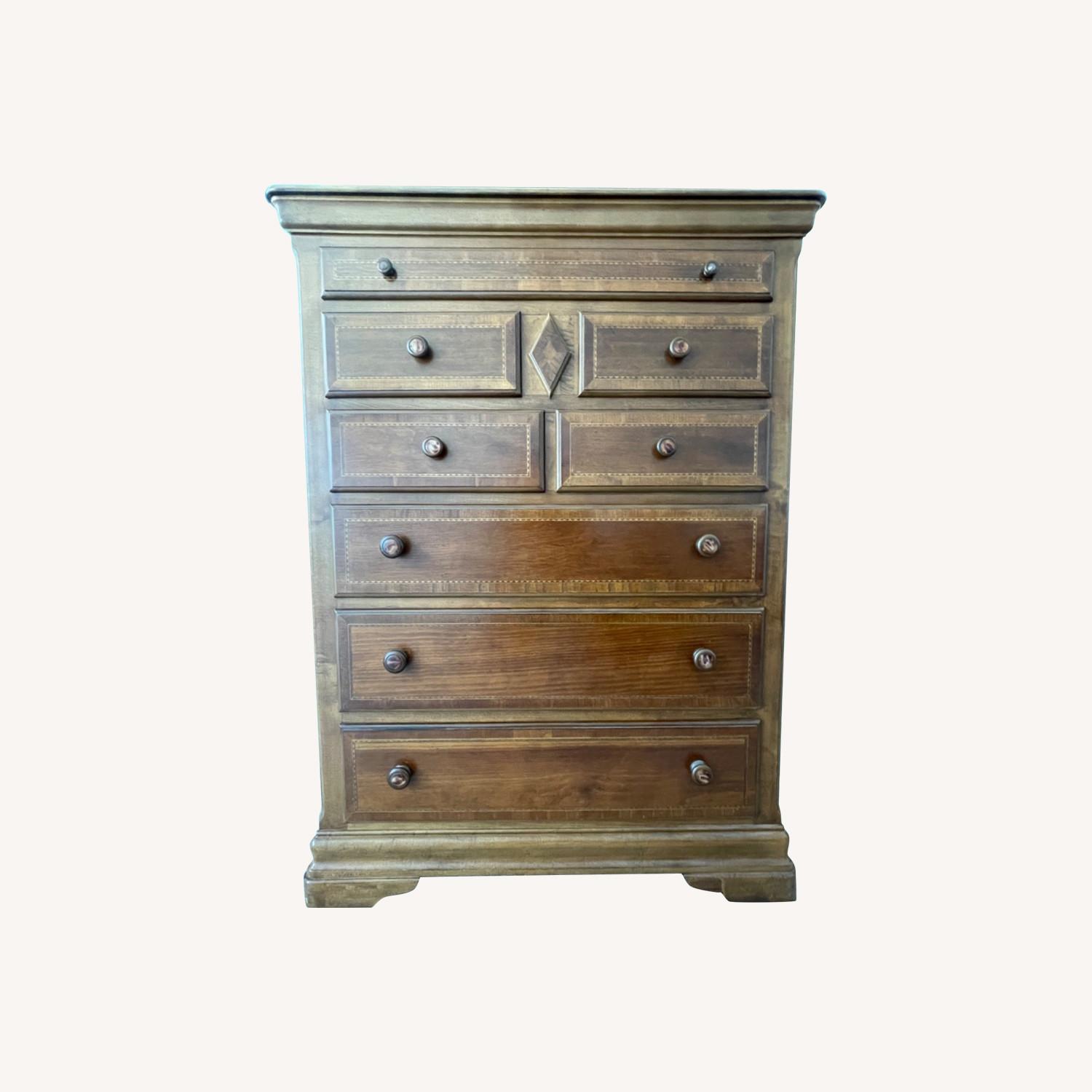 Seller's Notes:Alexander Julian Home Colours tall drawer chest. Includes 1 felt lined jewelry drawer. Beautiful intricate inlays. Solid craftsmanship