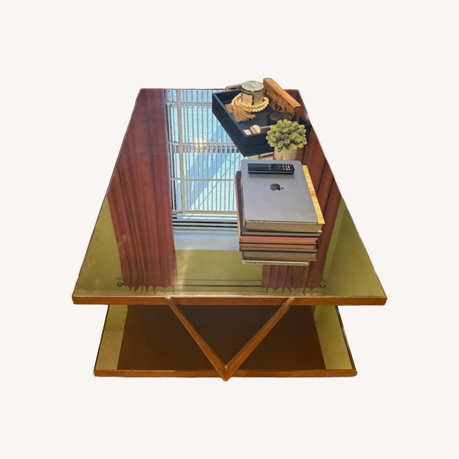 Seller's Notes:Julian Chichester has an enviable international reputation for high quality manufacturing, a truly innovative approach to material usage and regularly introduces unusual finishes across its extensive range of designs. Inspired by the craft of English furniture makers, influenced by mid-century designers, and informed by a life of travel and immersion in the arts, Julian Chichester has an admiration for innovation, which combine to give our designs a fresh contemporary contextualisation. A pretty two tiered metal Coffee Table finished in Brushed Aged Gold with contrasting Antique Mirror inserts. A tapered V holds the top and the table sits on tapered bun feet.