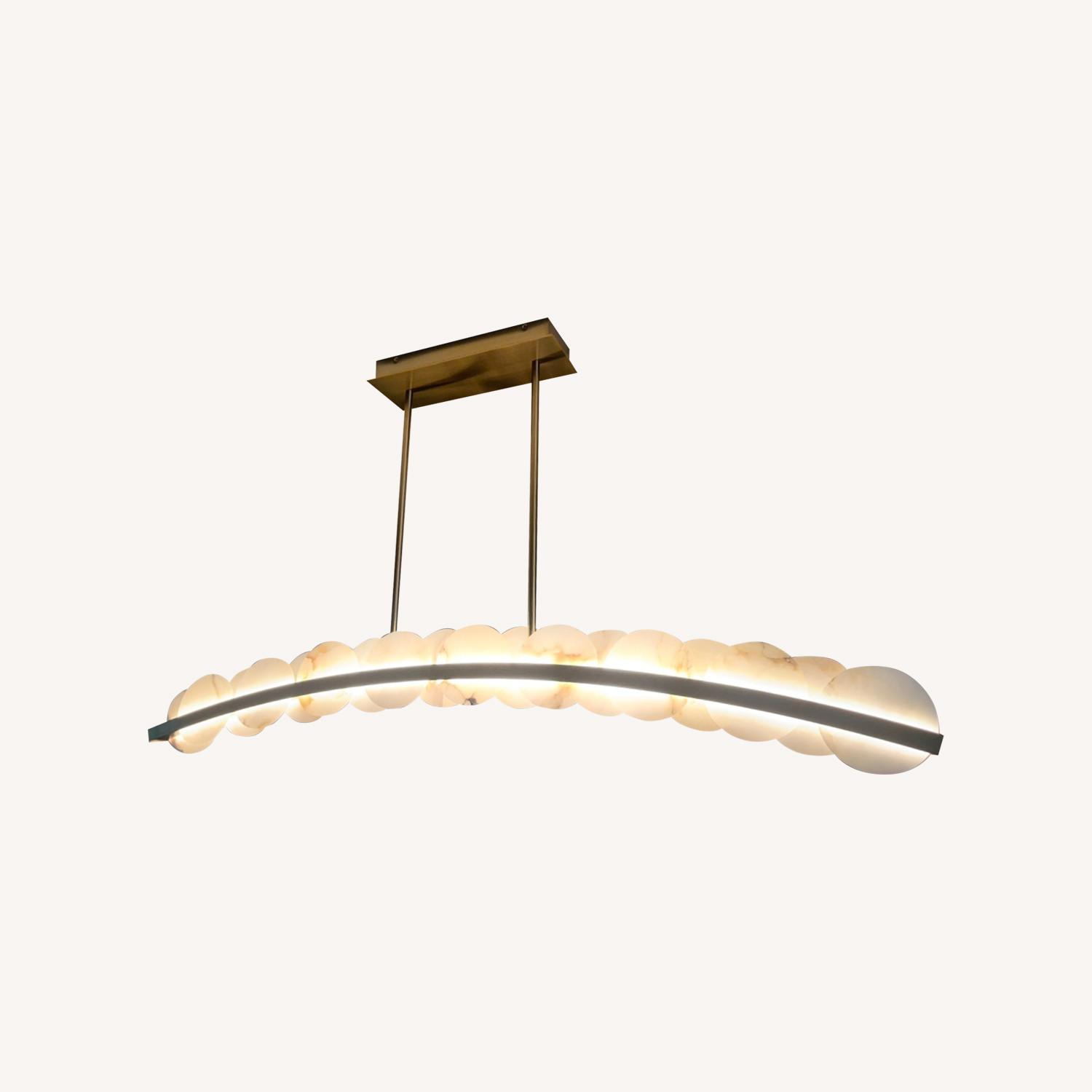 Seller's Notes:Retails for over $2000! Inspired by the soft glow of the moon, Meridian brings the beauty of the mineral stone indoors. This gently curved slim silhouette frame is accented with authentic Alabaster discs that diffuse the light. Features LED technology and a warm Winter Brass finish. Has only been installed for a few months but I have decided to change design direction which works in your favor! Professionally removed in early February.