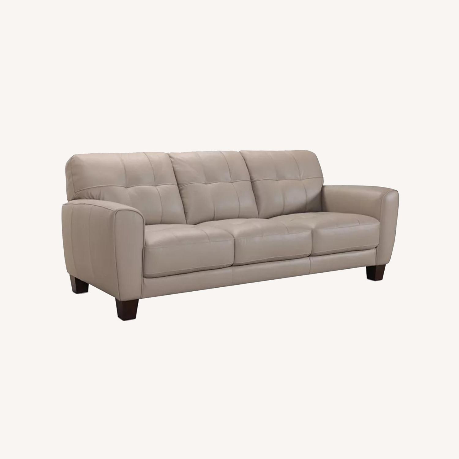 Seller's Notes:HUGE. SALE!!!!! The product has been used and is around 4 years old. It is made from leather and the color is Greige but look like a light grayish color. The product is 100% Leather, frame is corner blocked hardwood constructed with plywood exterior wall panels, and the smooth grain leather with a semi-gloss finish, silky hand; Aniline dyed hides have been buffed, embossed and feature natural markings.