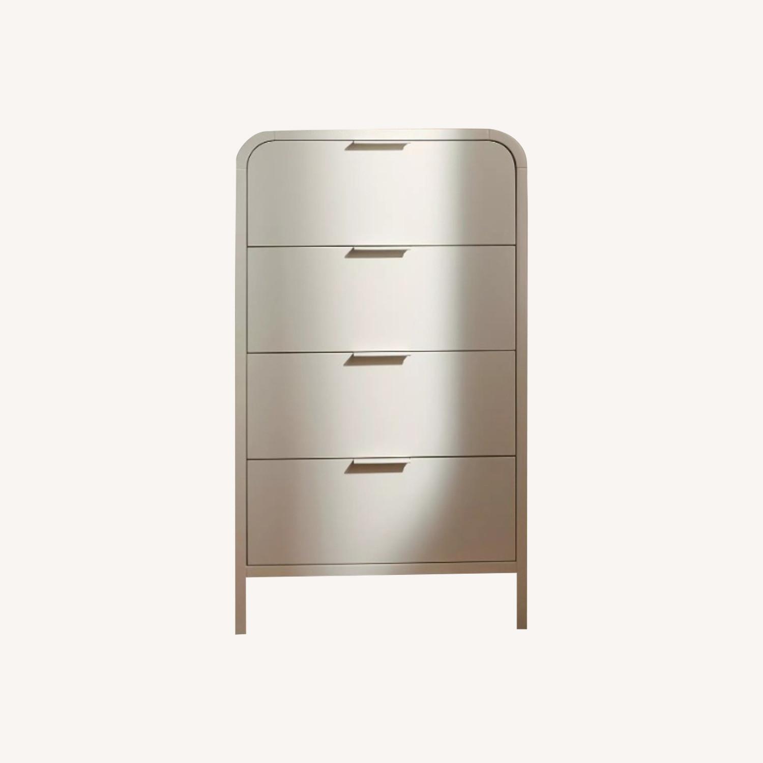Tall silhouette features curving corners for a soft touch with four spacious drawers set on metal glides for easy functionality.