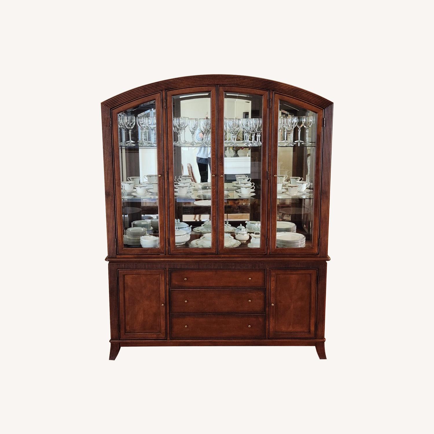 Seller's Notes:China hutch purchased as part of a dining room set. I absolutely love this beautiful set and would have no desire to get rid of it, were circumstances different. It holds so many wonderful memories of holidays and times with family & friends. Sadly, my husband passed away so I'm downsizing/redecorating. Top section is lighted, has a mirrored back and glass shelves with tracks for standing plates. Plenty of storage in bottom section: side cabinets are ~18" deep/16" wide with a single shelf. Center drawers are 26" wide - top drawer is shallow and felt lined for storage of fine silver. Bottom drawers are unlined & 5" deep. Unit disassembles into two pieces. There are a few very small scratches on the feet of the unit but otherwise, it is in great shape.