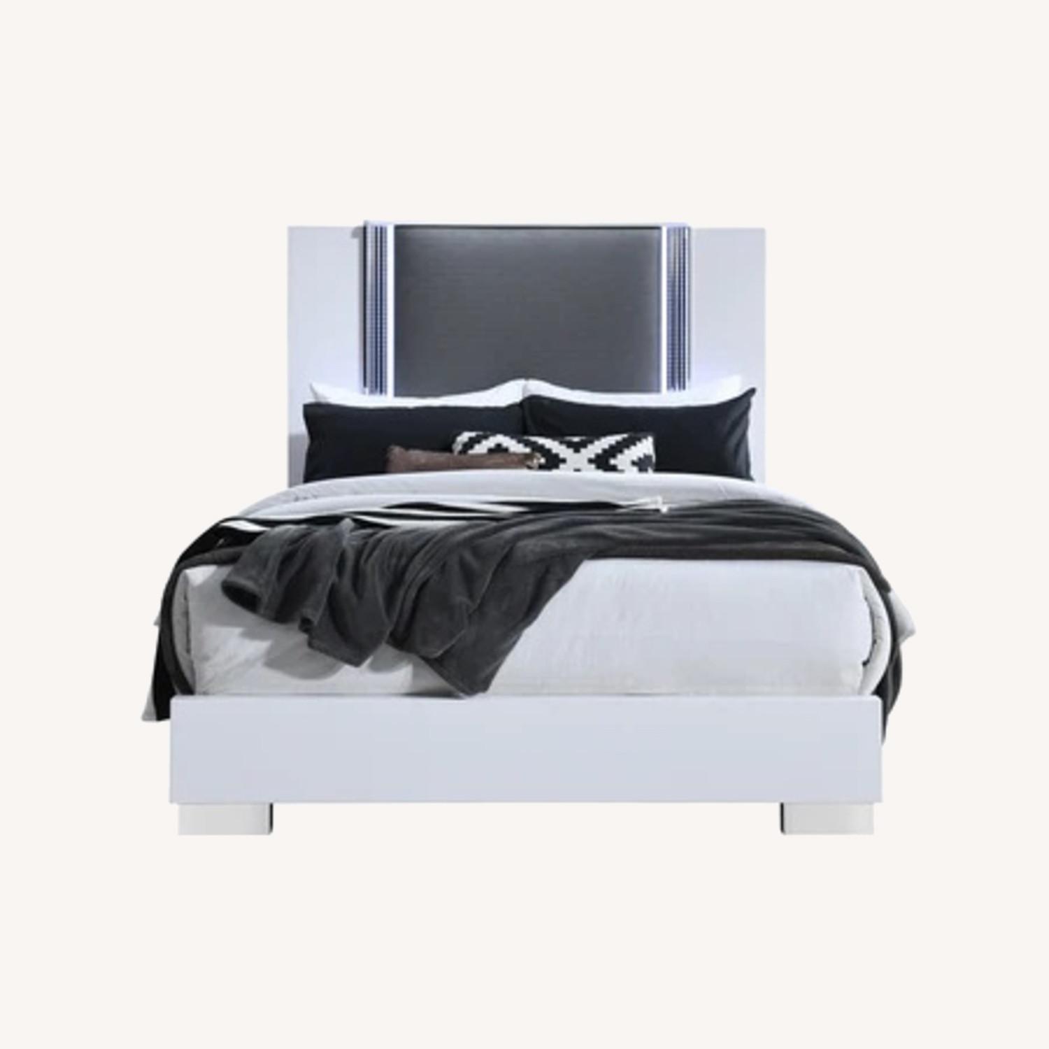Broadway White II Upholstered Lighted Panel bedroom collection has a white high gloss lacquer finish. Reflected LED lighting on every piece. Features polished chrome moldings and plinth bases. Crafted of Meranti and engineered wood. Platform bed with upholstered headboard for style and comfort.