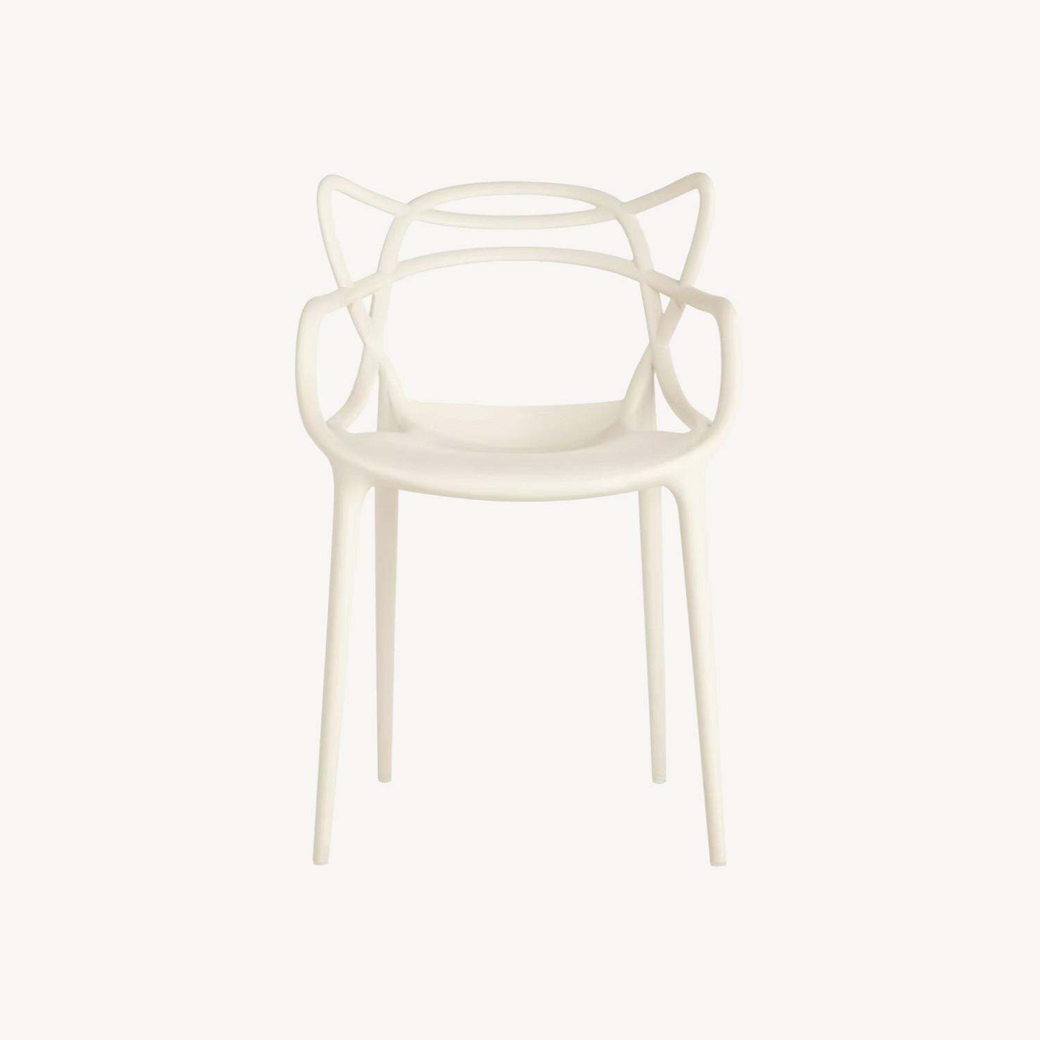 Seller's Notes:Kartell Masters Chair - White Creator: Phillipe Starck (Designer) Mfg: Kartell (Manufacturer) Dimensions: 33" H 22.4" W 18.5" D Style: Contemporary / Modern Materiality: Modified batch-dyed polypropylene Place of Origin: Italy Date: c. 2018 Condition: Good. Seller Location: New York, NY “The Masters chair is a tribute to three symbol-chairs, reworked and reinterpreted by Starck’s creative genius. The unmistakable silhouettes of Arne Jacobsen’s “Serie 7”, Eero Saarinen’s “Tulip Armchair” and Charles Eames’ “Eiffel Chair” entwine in a sinuous hybrid, creating a fusion of original and attractive styles. Light and practical, Masters can also be used outdoors. Also available in metallic finishes which convey and extra special effect.” - Kartell.com