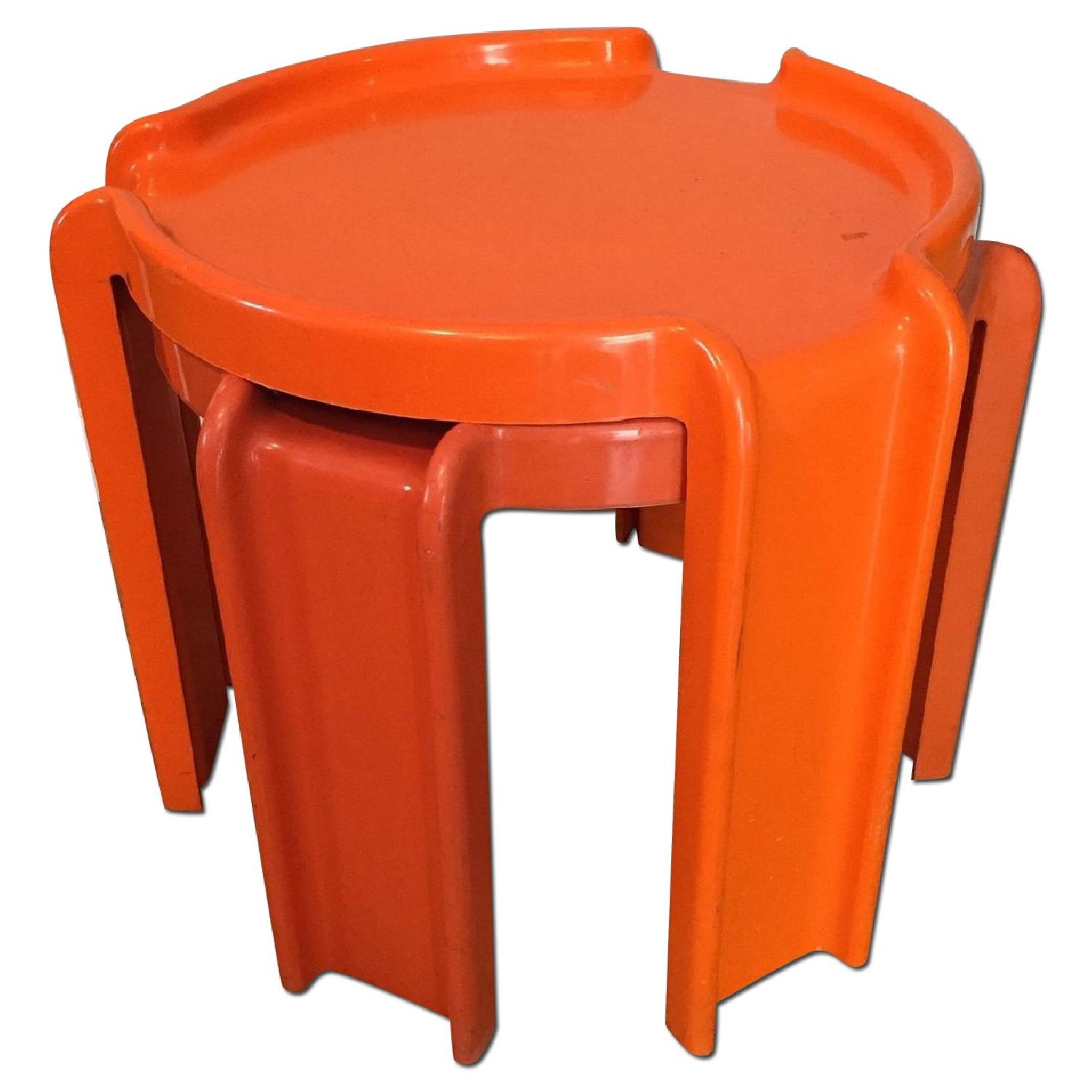Seller's Notes:A pair of orange Kartell vintage stacking cocktail tables designed by Giotto Stoppino. Both tables measure 18" in circumference. One is 16-1/4" tall and the other is 14-1/2" tall (so they can nest). The tables both have scuffs and a few minor dings from use. One table has hairline cracks at the top of one leg (see pictures) but still feels very sturdy. The colors aren't identical. 18 x 18 x 16 for fans of: Modern, mid century modern, mid-century, MCM, retro, vintage, Danish Modern, teak, 1950's, 1960's, 1970's, 1950s, 1960s, 1970s,Scandinavian, Sweden, Norway, Gunni Omann Junn, Arne Vodder, Arne Jacobsen, Kai Kristiansen, Hans Wegner, Borge Mogensen, Ole Wanscher, Peter Lovig Nielsen, Dansk, Jens Risom, Design Within Reach, dining room, dresser, bedroom, Paul McCobb, George Nelson, Jens Quistgaard, Adrian Pearsall, Craft Associates, Milo Baughman, Thayer Coggin, Broyhill Brasilia, Kent Coffey, American of Martinsville, Lane, Hooker Mainline, Svend Madsen, Niels Moller, Kofoed Hornslet, Niels Kofoed, Faarup, George Mulhauser, Charles Eames, Bruno Mathsson, Edward Wormley, Dunbar, Drexel Declaration, Kipp Stewart, Stewart MacDougall Lane Acclaim Johannes Andersen Denmark, Frem Rojle, Lawrence Peabody. Pottery lamp Dux Folke Ohlsson Herman Miller Peter Protzman Charles Pollock Sling Chair George Nelson Eero Saarinen Tulip Table Aluminum Group Soft Pad office desk leather Ray Charles Arteluce Gino Sarfatti designed 2097 Eames,Carl Aubock, Knoll Charles Pollock Jane Gordon Martz Marshall Studio lamp T-pull credenza Harry Bertoia Bird Diamond Chair, Hans Wegner, desk, dresser, dining room set, rosewood, teak, Jens Risom, American of Martinsville, Lawrence Peabody, Herman Miller, credenza, baby, crate and barrel, retro, dresser, chest, rosewood, Dansk, teak, George Nelson, Paul Mccobb, calvin group, Vladimir Kagan, Lane Acclaim, Planner group, Herman Miller, fifties, sixties, seventies, office, desk American of Martinsville, Dania Collection, rosewood, platform bench, rosewood, Selig, Folke Ohlsson Harry Bertoia, Kartel , Danish modern, George Nelson,CSS Wall Unit, Poul Cadovious, ESU, Eames Storage Unit, 50s Wall Unit, Retro Shelves, Vintage clock, Nils Strinning, clocks, wall, lights, lighting, pendant light, flying saucer, bubble lamp, cigar pendant, Wassily, Marcel Breuer, Paul Evans
