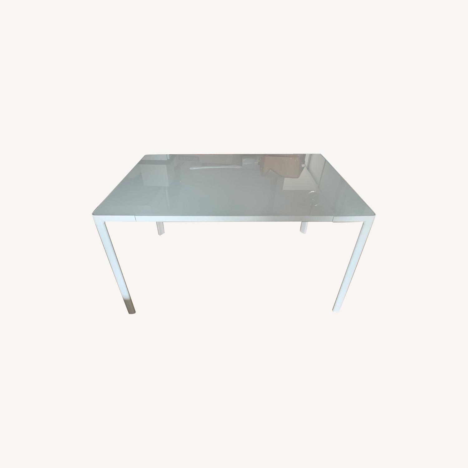 Seller's Notes:Excellent condition. This is one of the best dining tables Karell has made and it was discontinued last year, so it's recently vintage. The extension pieces are built into the table and slide/lock back invisibly inside the table when not in use. Kartell’s extension table designed by the renowned Piero Lissoni. Zoom has a solid and rigorous frame but the legs taper its shape. The tempered glass top back-painted white is elegant and austere but is also sturdy and scratch resistant. Made of: Tempered glass top / white aluminum base. Dimensions: 51.5” in length when not extended and 33.5” deep; can extend to be either 75.5” or 99.5” in length; 28.5” high.
