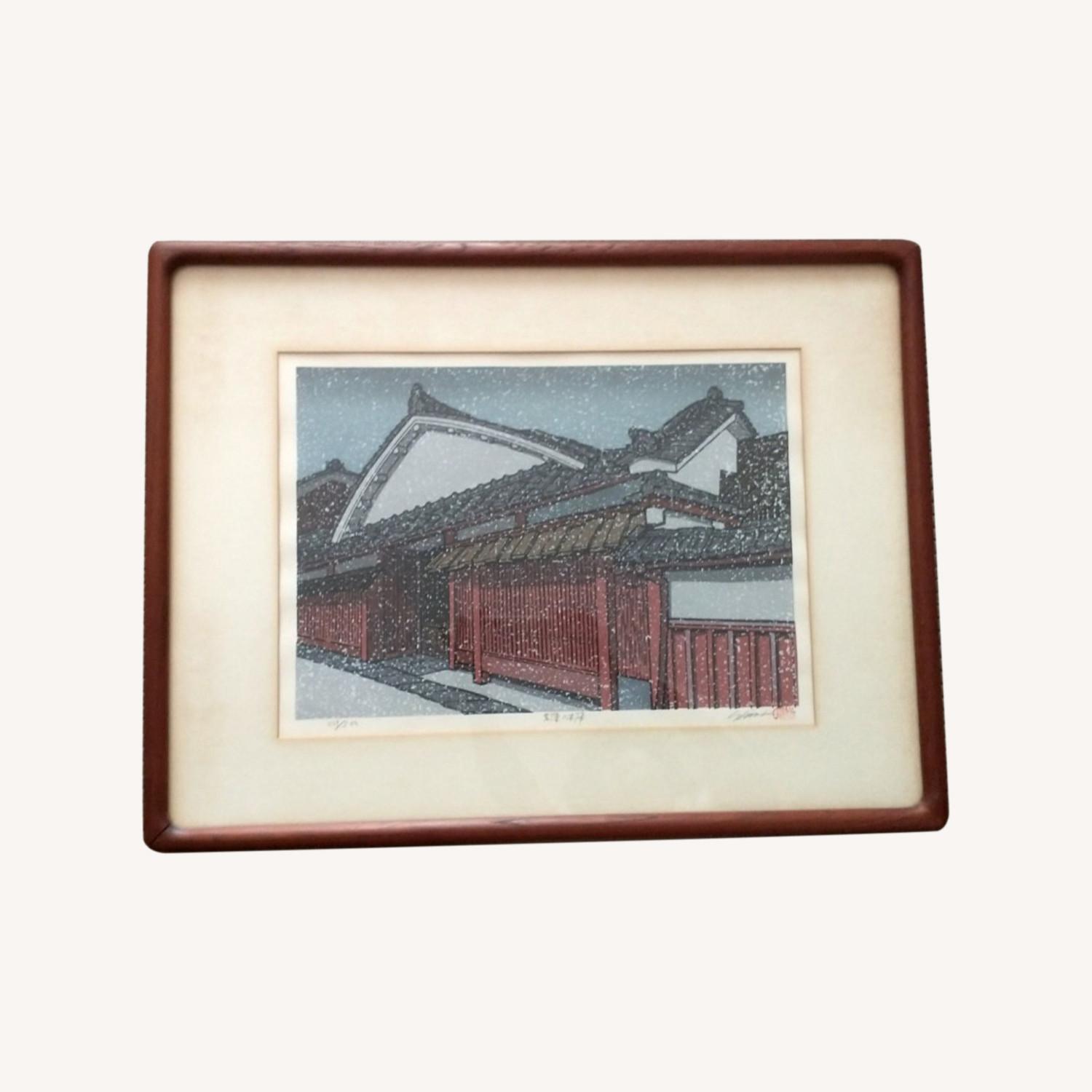 Seller's Notes:A framed Katsuyuki Nishijima (sometimes written as Nishijima Katsuyuki) original color woodblock print (1980 is the date it was acquires, so dated somewhat earlier) titled "Snow", acquired at Brentano's many years ago (Please see certificate of authenticity in one of the photos). Katsuyuki Nishijima is a contemporary Japanese artist (born in 1945) The print depicts a shop front in heavy snow. This is an original, kanji titled, pencil-signed and sealed, limited edition print numbered 429/500 in the bottom margin. Paper size nearly 12 1/2" x 17 1/2" (image: 11 1/8" x 16). Full margins. The size specified on the listing is the framed size: approximately is 25 x 19 and a bit less than 1 inch in depth. Under glass with a passe-partout, in simple and elegant wood frame. The condition is excellent, under glass since acquired, but the condition specifications of the site are not intended for art.