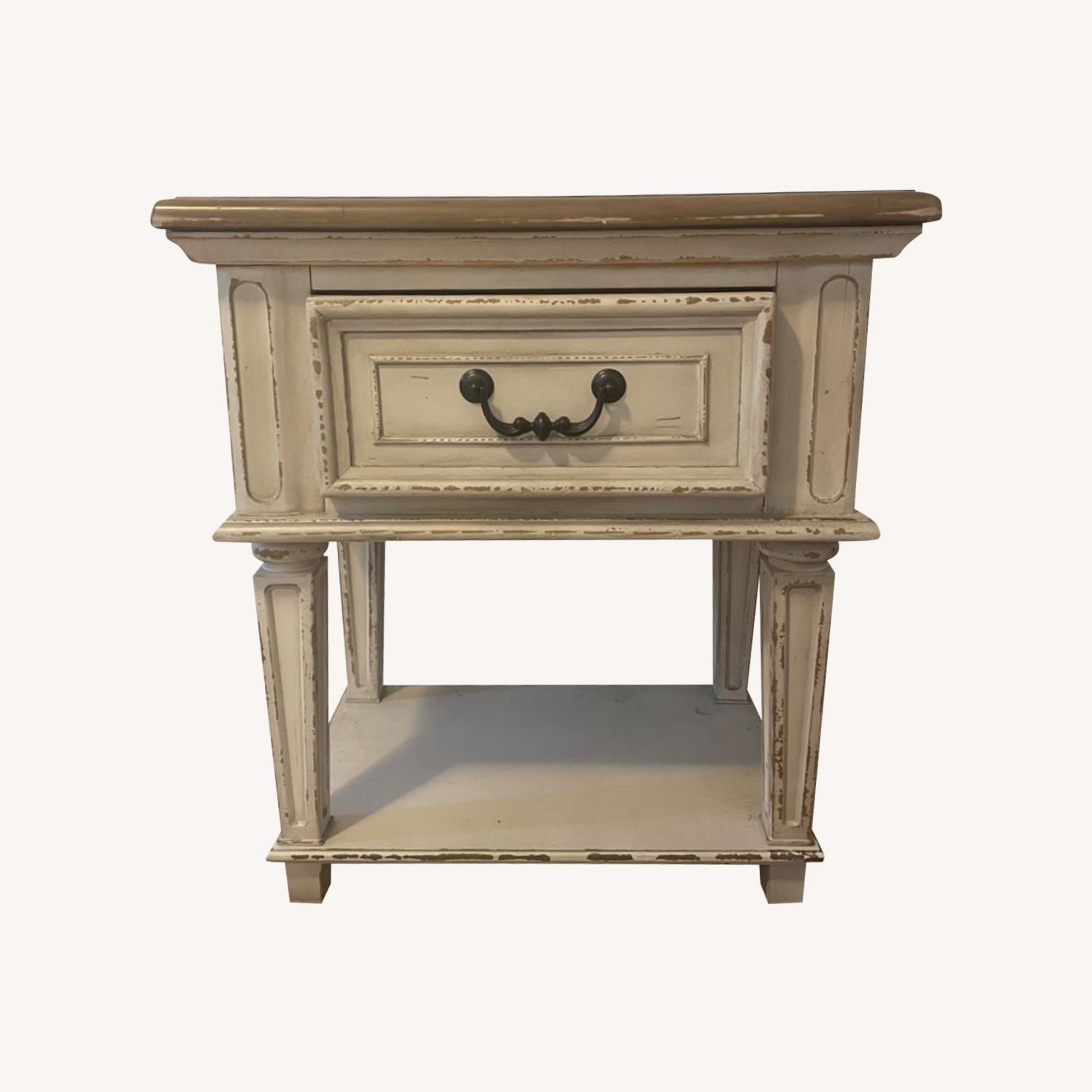 Seller's Notes:Distressed, farmhouse style nightstand with elegant, French country aesthetic. This piece is from Kelly Clarkson’s furniture line and retails for $200 online. The drawers are velvet lined and slide smoothly.