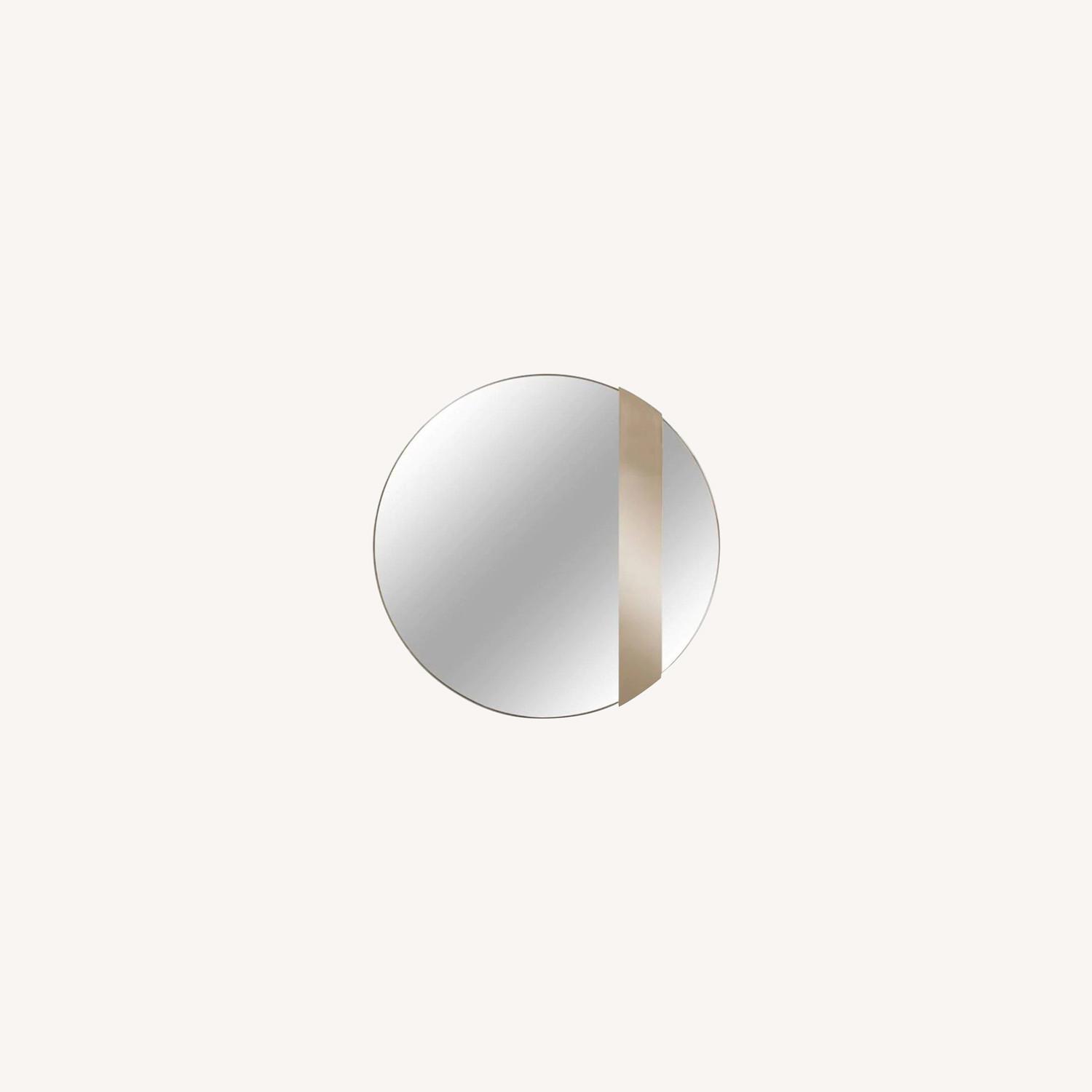 Seller's Notes:A classic, round mirror with rose gold trim detailing, accented with a statement, off-centre stainless steel band finished in rose gold. Materials: Mirror, Decor in stainless steel with color plating Finish: Taupe Oak & Rose Gold 47.2" x 1.4" x 47.2"