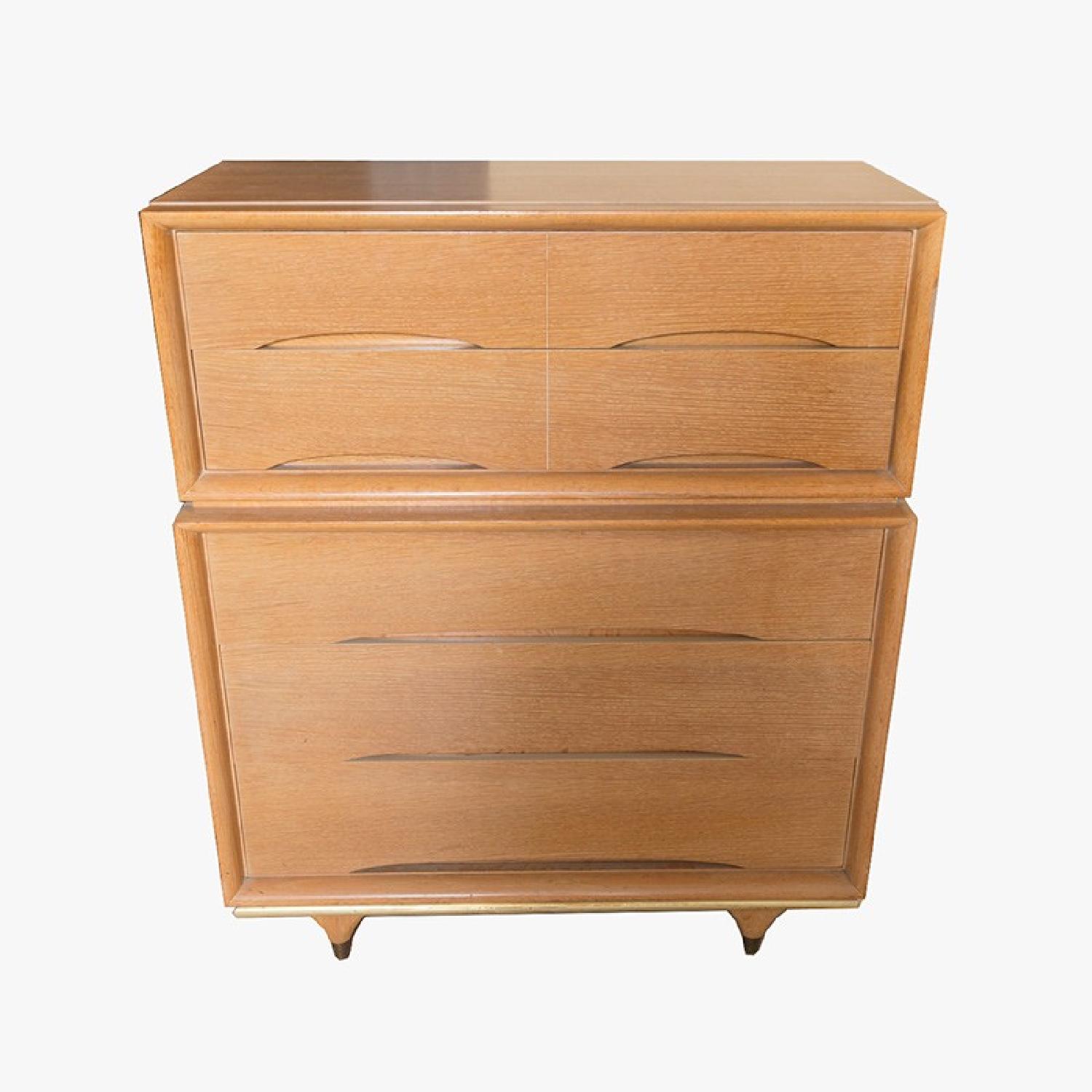 Seller's Notes:A Mid Century Modern The Elegante chest on chest by Kent-Coffey. This rectangular top chest features two full width, stacked drawers with inlay scoop handles above three additional drawers rising on tapered legs with brass cap feet. This piece is marked “Kent-Coffey The Elegante” to a drawer interior. The tops of the drawers have been painted to match the veneer. Some scratches exist. 40.0" W x 48.0" H x 20.0" D I have a matching 9 drawer dresser and mirror available and listed. More photos available upon request. Can be refinished for additional fee.