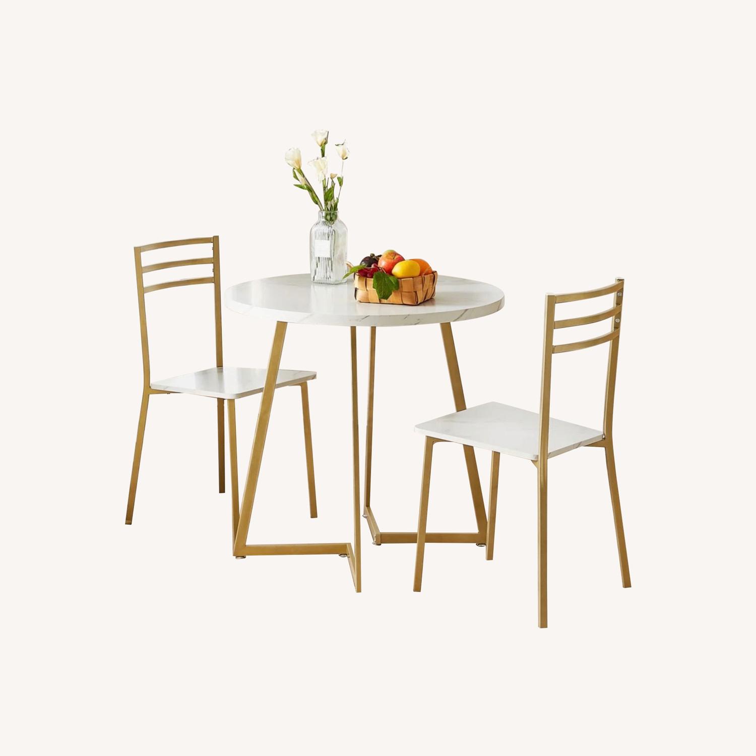 Seller's Notes:This 3-piece dining set elevates your space with a minimalist, modern aesthetic. It includes one modest-sized dining table and two dining side chairs, all with frames made from steel and engineered wood surfaces.