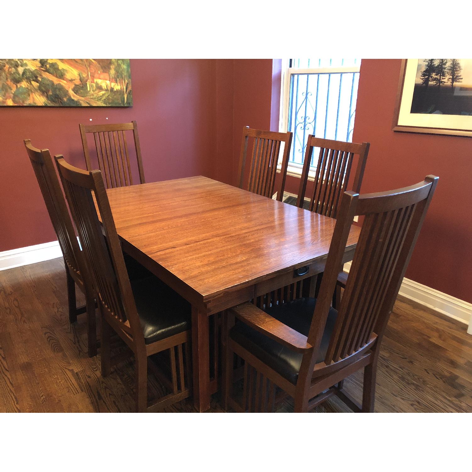 Seller's Notes:Selling Classic Mission Style dining room set. Includes 6 chairs with dark brown leather seats (easy to clean). Table comes with 2 leaves of 18" each. All in good condition. Willing to sell as set or separates. Changing layout of kitchen and can no longer fit in space. 66" x 42" table with 2 x 18" leaves Buffet is also available under separate listing
