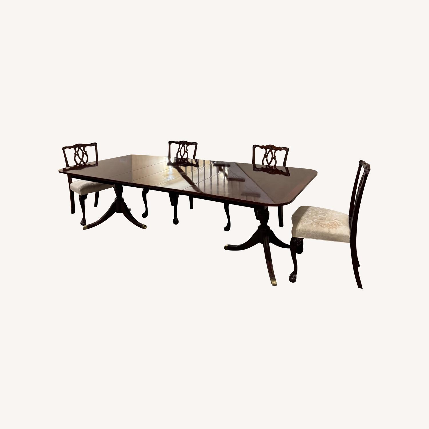 Seller's Notes:High end luxury dining room table with 6 matching chairs. There are three tables leaves each 12 inches long you can take you to shorten the table. Table has signs of distressing on corners and scratches in areas shown in the photos. The chairs will need to be reupholstered as there are signs of wear. Overall high quality antique dining room set.