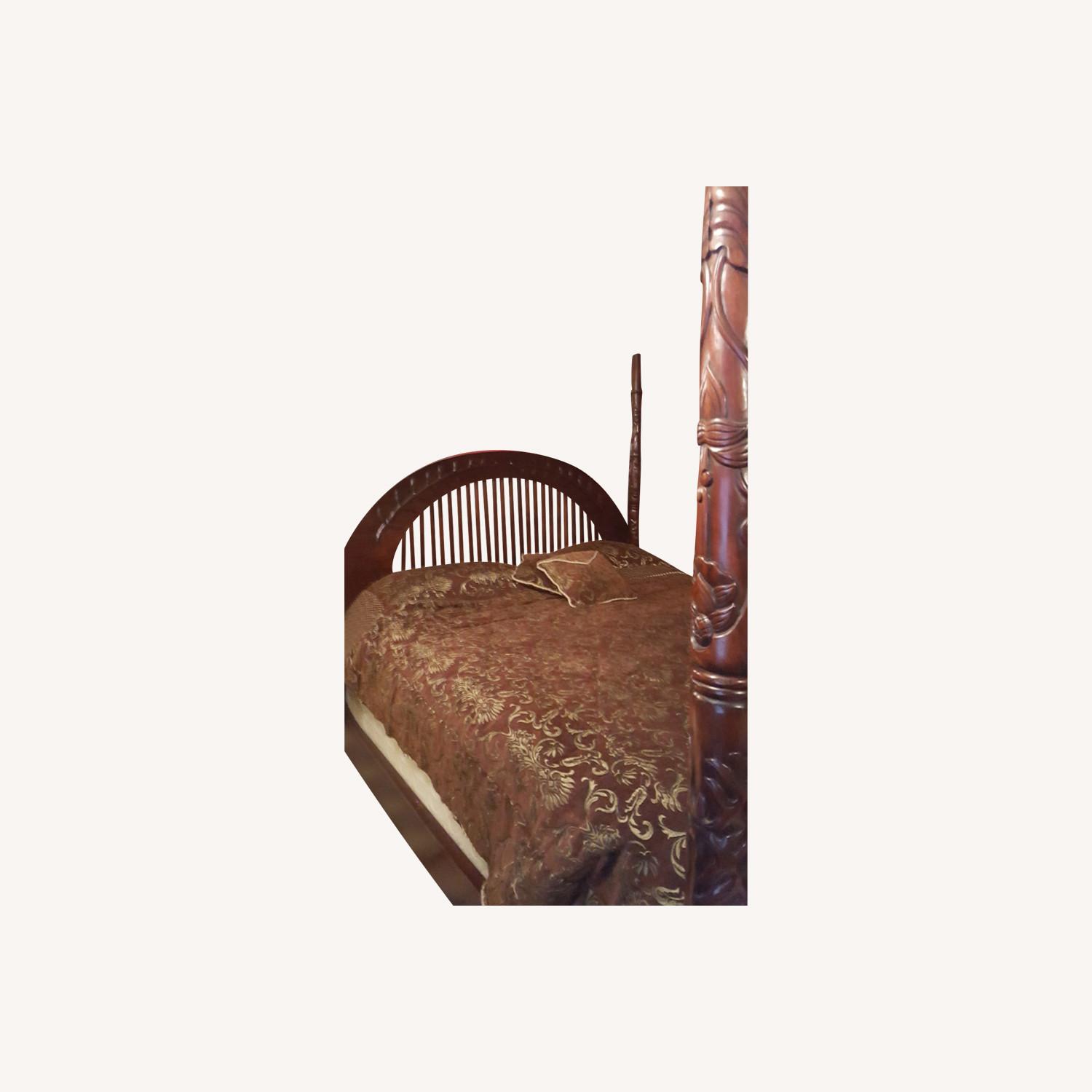 Seller's Notes:Solid wood-- all hand carved -- four poster bedframe footboard & slats This was custom ordered and made in Honduras or Belize has a Island motif. it is a large heavy bed for a sizeable room A statement piece. It sits high and has a ladder for access if needed. Requires mattress and box spring it is all wood with regular wear on side frame that can be easily covered. it is cherry stained [medium brown] Wood Side frame is 2 inches thick -- bed is disassembled and stored Matching dresser mirror nightstands and chest available. This beautiful bed is only for those who appreciate high quality workmanship