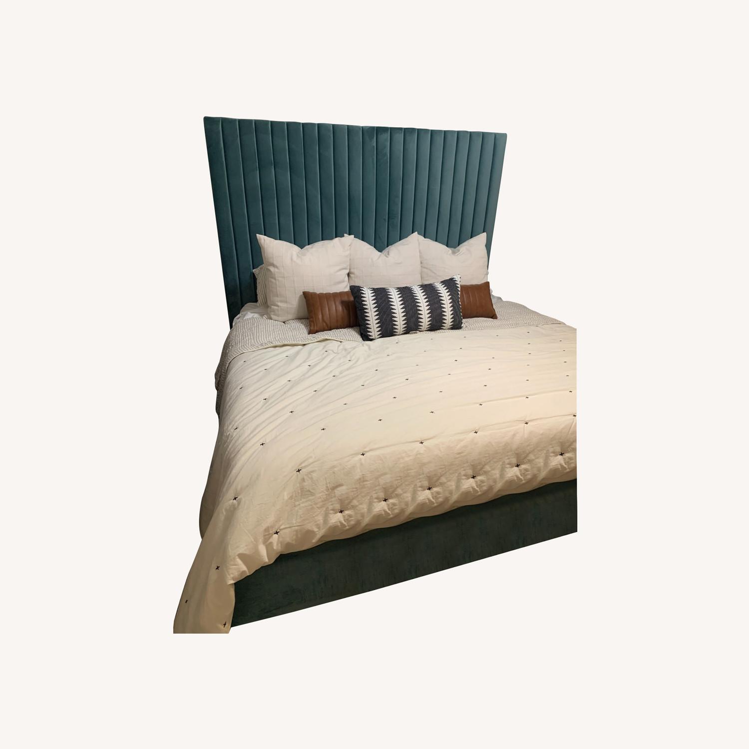 Seller's Notes:Love this bed! Still in amazing condition. No box spring needed. Beautiful teal green color and tall headboard in velvet. We have to downsize and are getting rid of it but sad to part with it. Great for a pop of color/ statement piece to your master or guest bedroom. Fits a standard King size mattress easily.