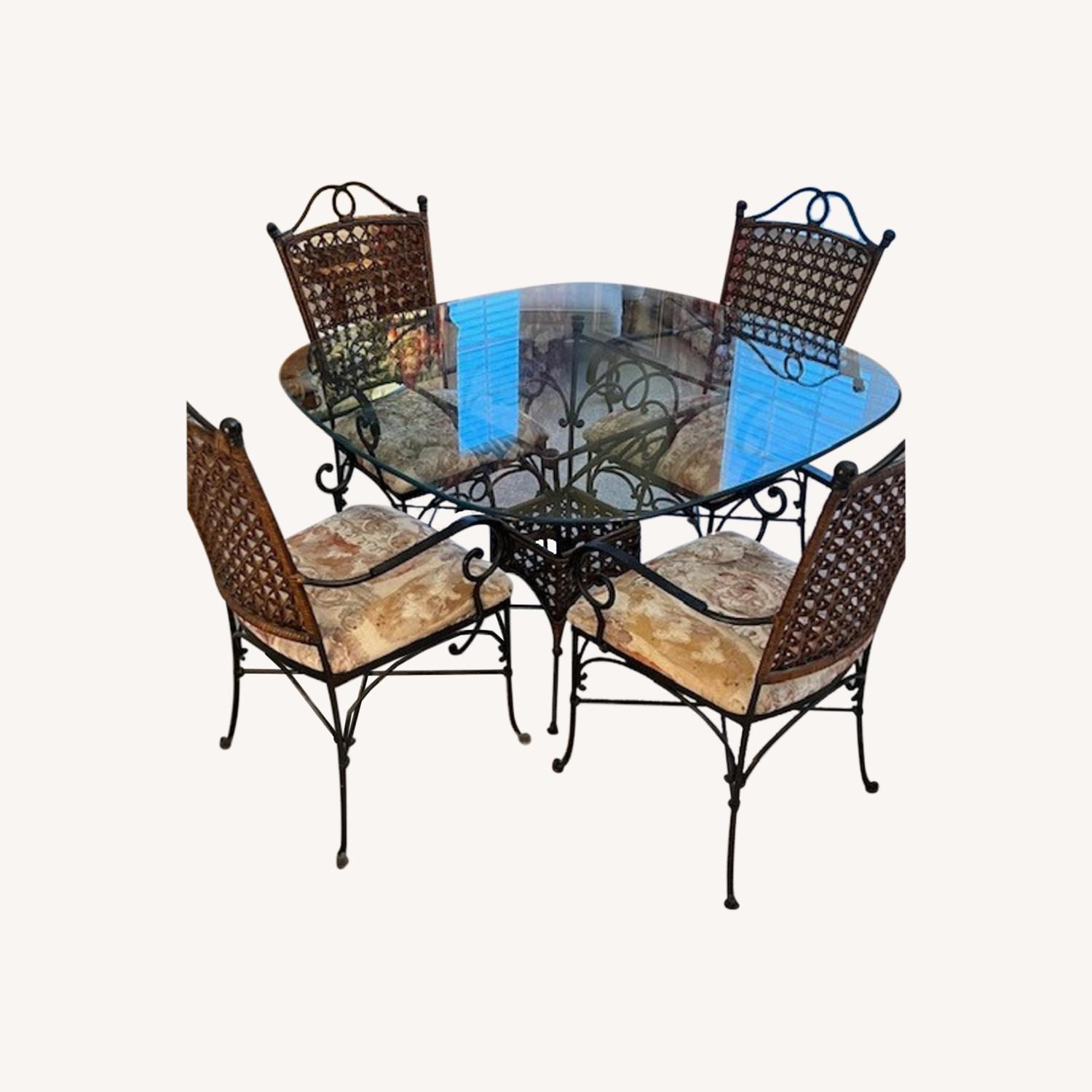 Seller's Notes:Purchased item approx 8 years ago for my kitchen in my home. Only used several times and in past 5 years not at all. Now use Dining room for family meals. This set is like new. Beautiful Belveled thick glass top. Glass is rounded at all 4 corners and is 45" wide on each side. 4 beautiful wrought iron chairs with think decorative padding. Very comfortable. Great value, and ready to sell.