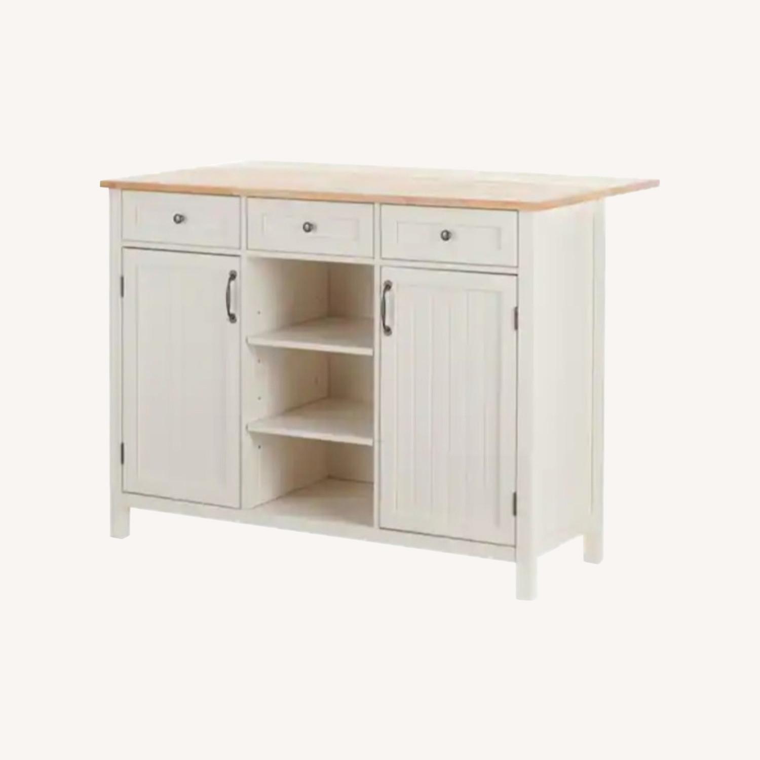 Seller's Notes:Blemishes are shown in last three pictures Classic Farmhouse Beadboard Doors 2 doors conceal 2 adjustable interior shelves 3 storage drawers 3 exterior adjustable shelves for open storage Crafted of wood Ivory finish with a contrasting natural finished top Roomy storage for a dining room, kitchen or any area where extra storage is needed Kitchen island measures 36 in. H x 47.5 in. W x 30 in. D Drop leaf dimensions 47.5 in W x 12.0 in D Product Dimensions: 47.50 in W. x 30 in D. x 36 in H.