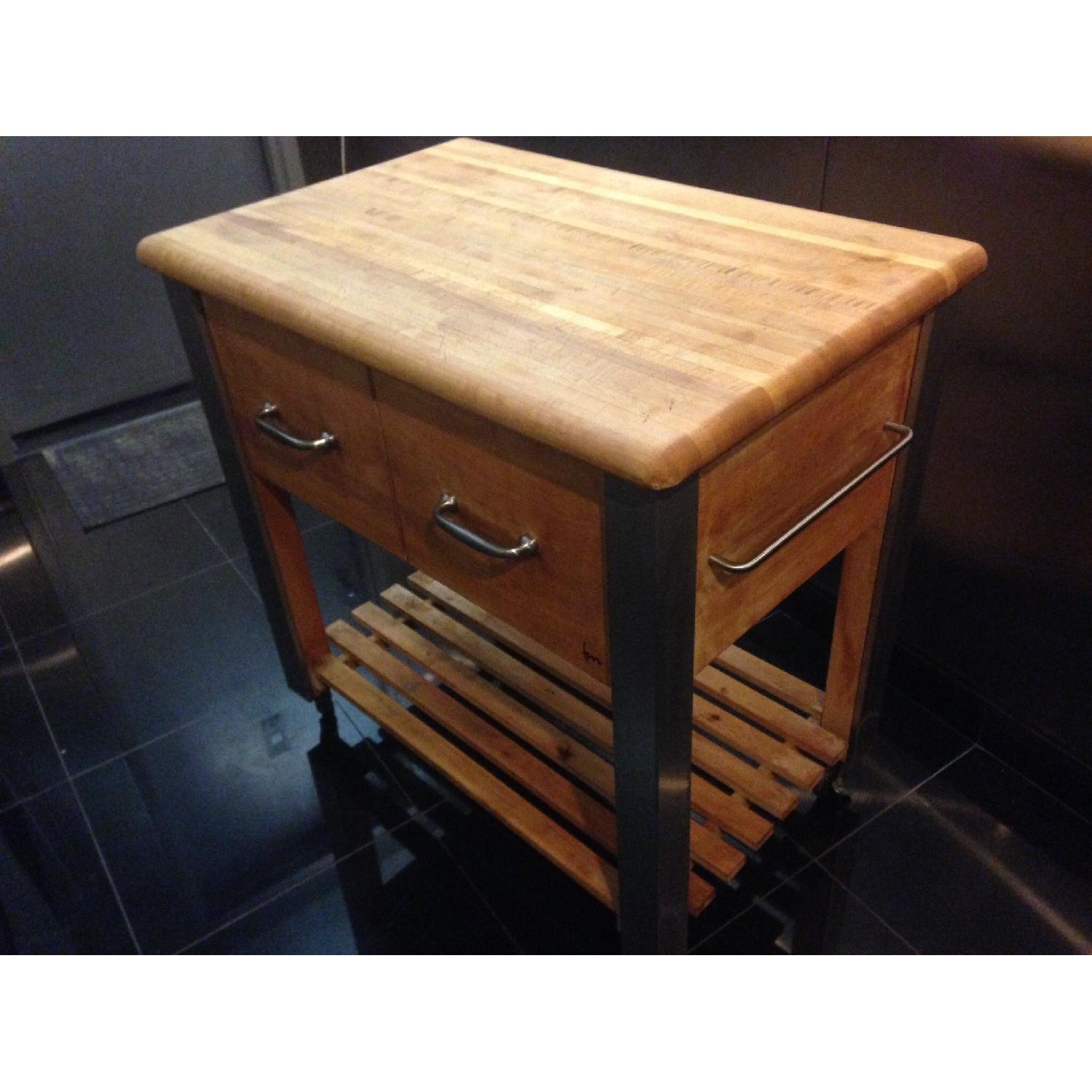 Seller's Notes:butcher block top one very deep drawer w/2 sections one shelf below towel racks on side Stainless steel sides on the legs for a very upscale look