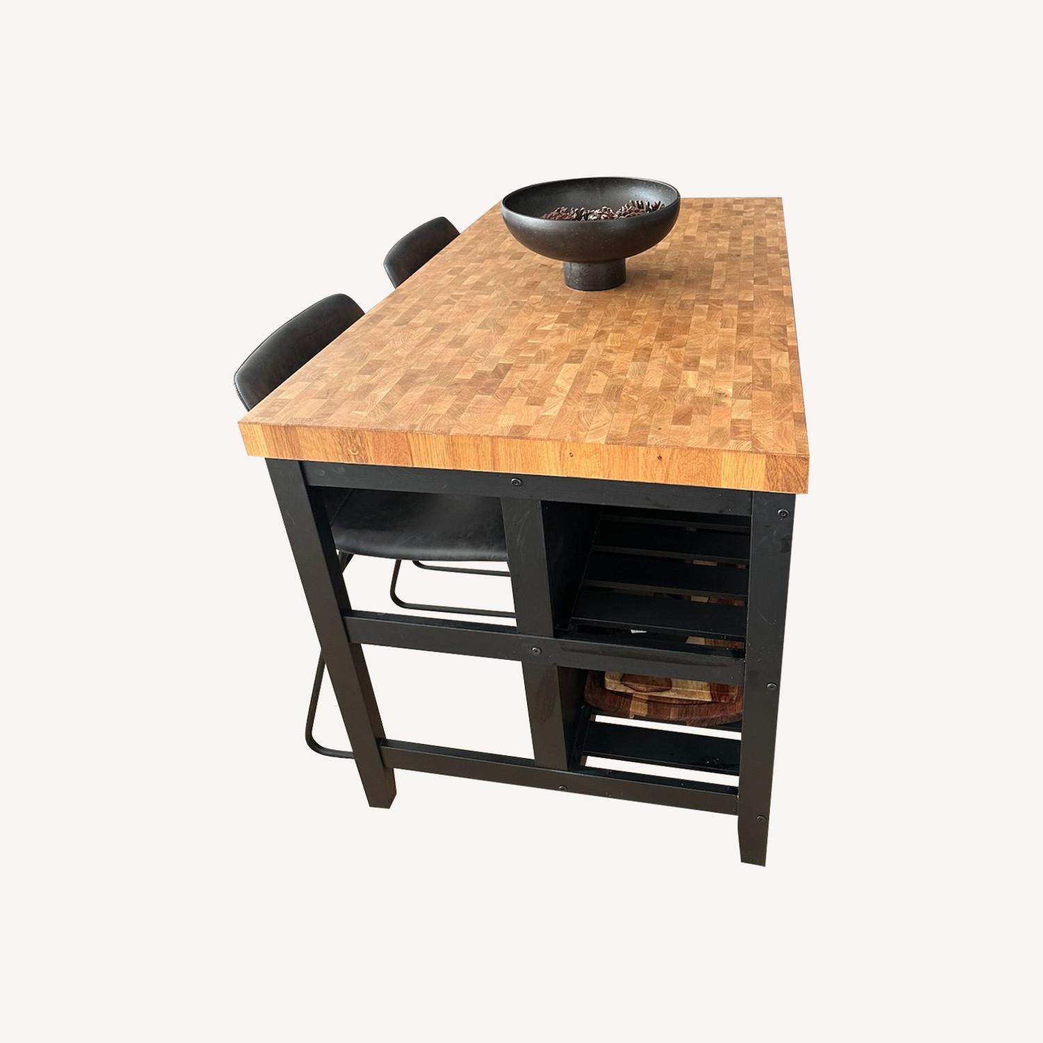 Seller's Notes:Free-standing kitchen island and matching high chairs; easy to place where you want it in the kitchen. Good condition - Very minor scratch or two which is barely noticeable. Gives you extra storage, utility and work space. Countertop with a thick oak veneer, a durable natural material that can be sanded and surface treated when required. For quick installation and easy maintenance the countertop is pre-treated with hard wax oil. Layer construction adds stability and makes the countertop less sensitive to humidity, thus, less likely to bend, split or crack than solid wood. The countertop has an end-grain design that gives it a rustic charm that complements traditional kitchen styles. The expression is enhanced by design on the edges.