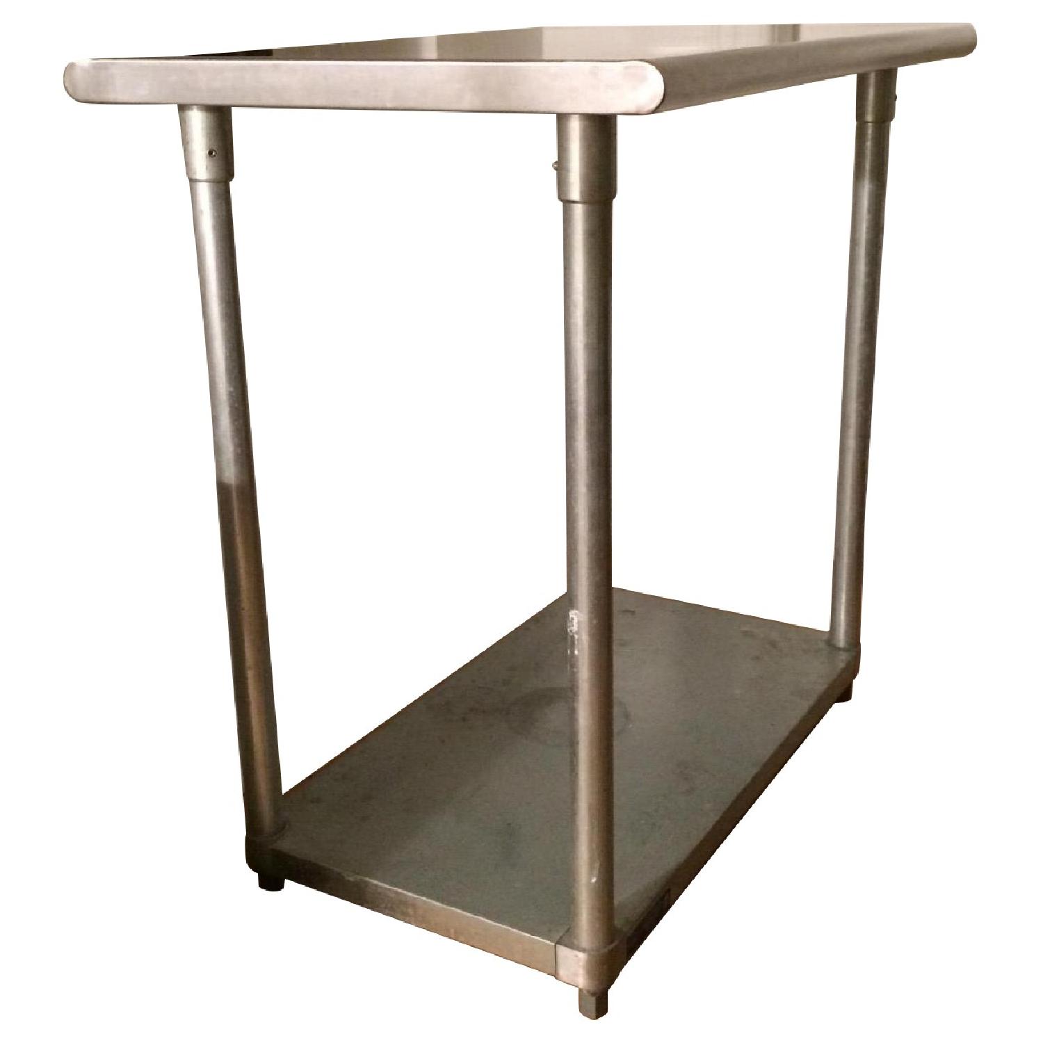 Seller's Notes:This stainless steel, industrial chic table has normal wear and tear in the form of scratches and some minor stains the but is otherwise in excellent condition. The stool set makes it a perfect addition to a kitchen where two will be dining regularly.