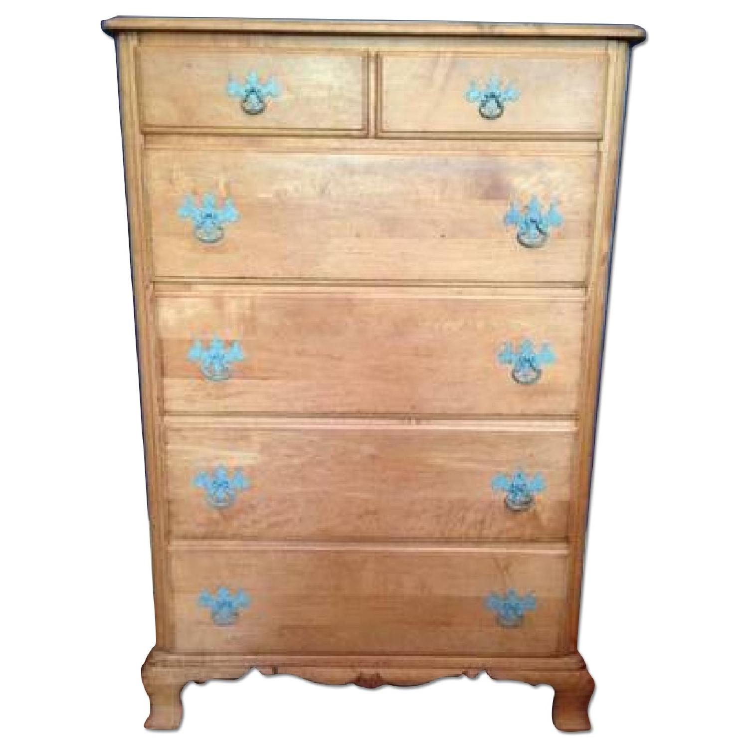 Seller's Notes:Lovely antique 6-drawer highboy with solid maple wood construction. - brass accents (sponge painted teal. can easily be repainted/stripped) - beautiful grain finish - dovetail drawers that all open and close with ease - great condition with only slight watermark on top right (pictured) Measurements: Height- 48" Width- 32" Depth- 18" In great condition! by Kling Furniture Chippendale Style Circa 1950s