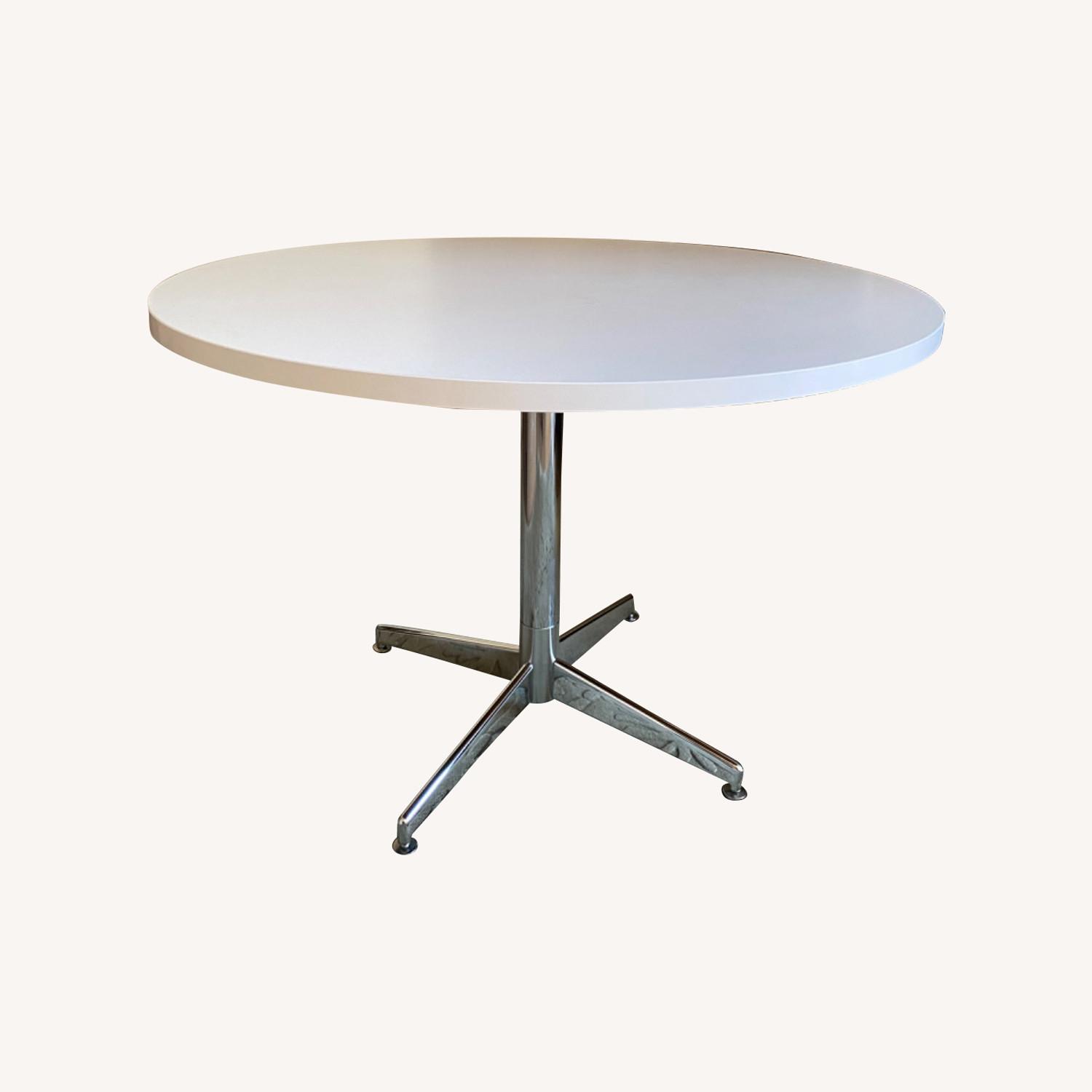Seller's Notes:Original Knoll EQ table in white laminate and polished chrome base. This is a heavy, contract quality table suitable as a meeting or dining table.