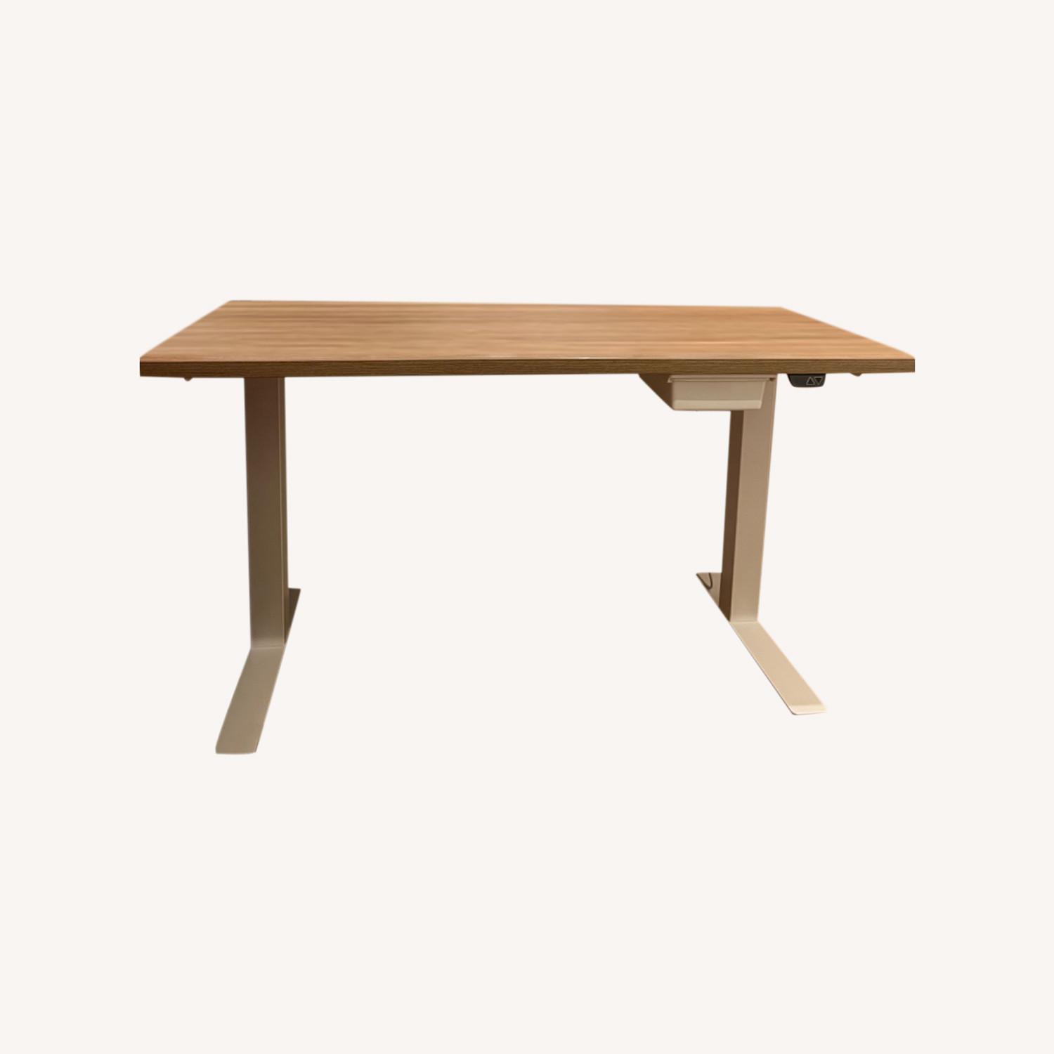 Seller's Notes:Classic oak desktop with white metal base, knoll adjustable height standing desk. Height adjusts from 29”-47” tall. Willing to include the monitor and monitor mount. Great condition, works perfectly with no blemishes on the surface or legs. Selling because we are converting the office to a nursery.