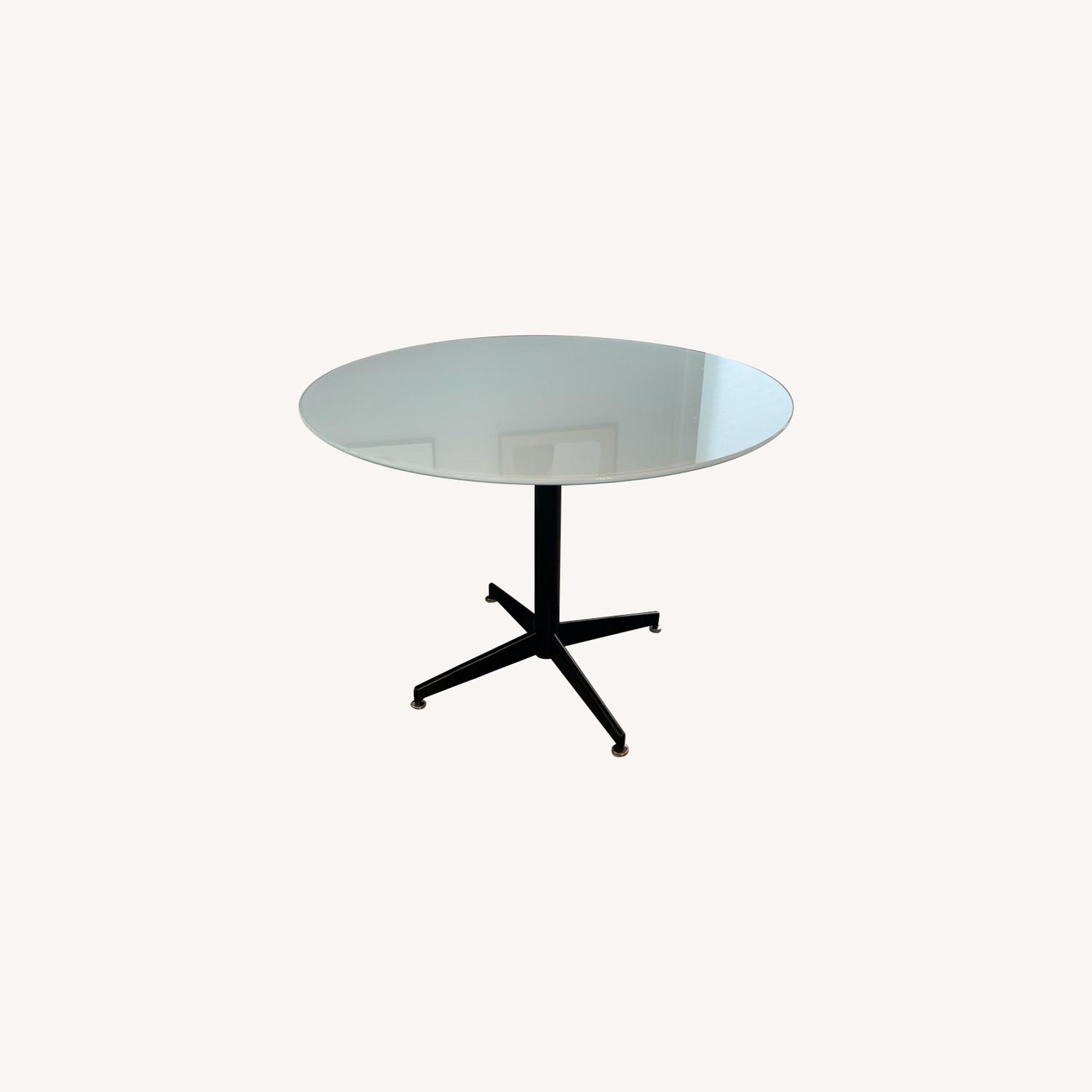 Seller's Notes:Currently being used a breakfast nook table, but we need something bigger. The top is white back painted glass with a black spot underneath (see pic). The top rests on the base.