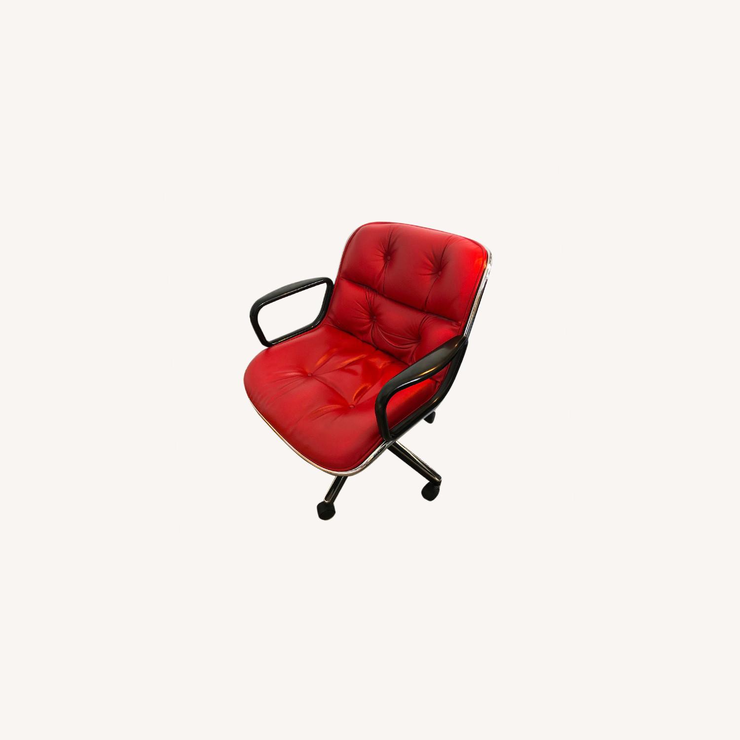Seller's Notes:The Pollock chair continues to maintain its quintessential role with its timeless and contemporary elegance. Offered in red leather, the versatile and extremely comfortable chair features a waterfall front, thick tufted upholstery and a signature aluminum rim. The Pollock chair is the perfect choice for conference rooms and private offices as well as many other environments. Exemplified in the conceptual visions of his designs, Charles Pollock has a strong internal and emotional connection to seating. It was Florence Knoll's recognition of his unique talent that secured his reputation as one of the world's preeminent furniture designers. He is the recipient of many awards including Pratt Institute's 1991 Excellence by Design Award. The Pollock executive series features 360 degree swivel, tilt with tilt tension and pneumatic seat height adjustment.