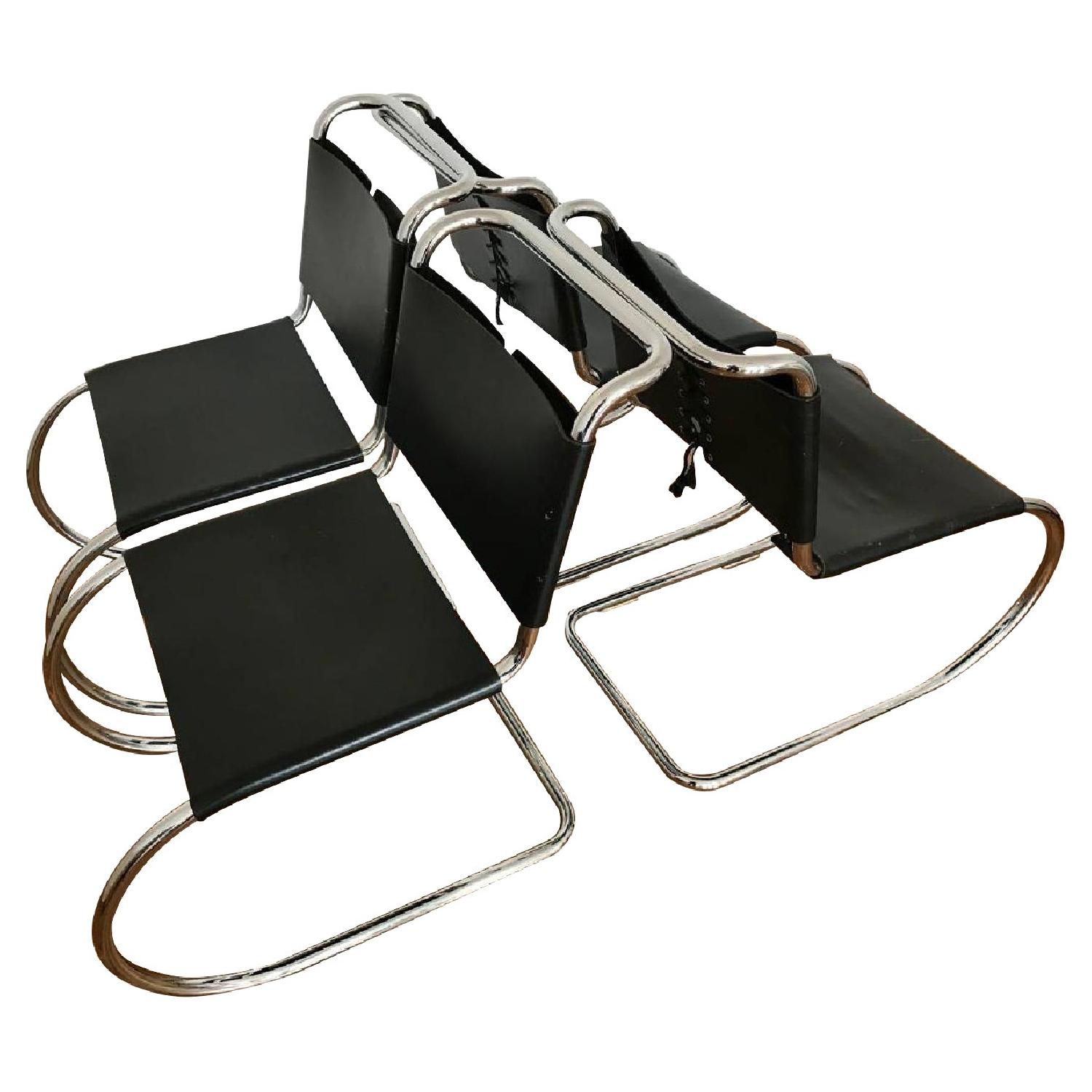 Seller's Notes:Set of four Chrome Cantilever Chairs with Black Leather by Ludwig Mies Van Der Rohe, 1927. The MR Side Chair in Black Cowhide features belted leather to create a hammock-like sitting experience. The natural tones of the cow hide leather stand in stark contrast to the chrome frame. Brand new from Knoll, modern versions of this chair retail for $1561 each plus 13 weeks shipping.(would prefer to sell as set). They are in excellent vintage condition with very little signs of age on the black cowhide leather and no rusting at all. Rarely used they and the table were kept at our Summer house which we are also getting rid of due to the move. DESIGNER: LUDWIG MIES VAN DER ROHE (DESIGNER) DESIGN PERIOD: 1920 to 1949 MANUFACTURER: KNOLL MANUFACTURE PERIOD: CIRCA 1960S OF THE PERIOD: AMERICAN MODERN CLASSIC MATERIALS AND TECHNIQUES: CHROME, LEATHER CONDITION: Good, especially after 17 years of moderate use! SET: 4 SKU: WG-99449 Measurements are: 20"wide x 28" deep x 32" high, seat height 19" The MR Collection represents some of the earliest steel furniture designs by Mies van der Rohe. The material choice was inspired by fellow Bauhaus master Marcel Breuer, while the forms are thought to be modern derivatives of 19th century iron rocking chairs. The MR dining chair was designed in 1931 by Mies van der Rohe and produced by Knoll at the time.