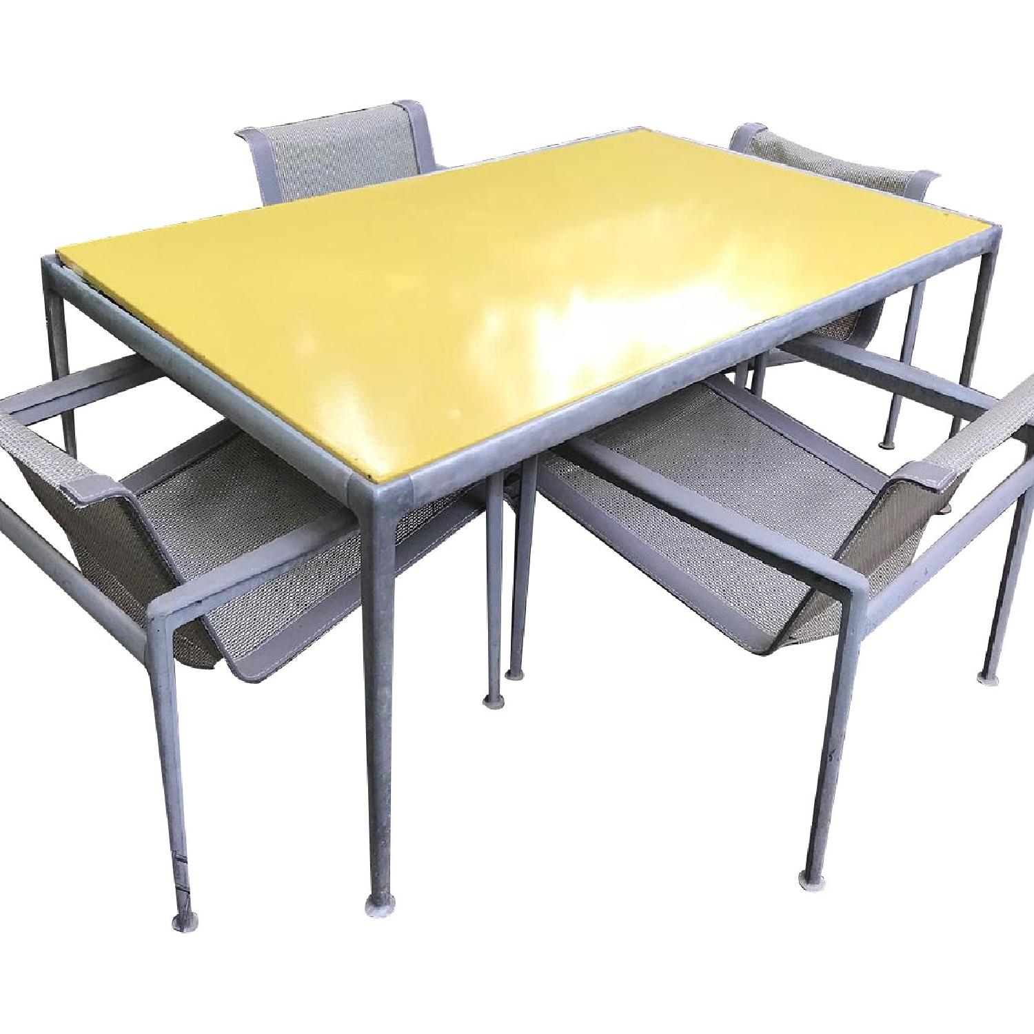 Seller's Notes:Richard Schultz's outdoor dining set have been setting the scene for modern meals outdoors for over 50 years. The aluminum frame makes them resilient to weather and wind, while the signature mesh back keeps you cool. CONSTRUCTION AND DETAILS Seat and back are woven vinyl coated polyester mesh. Straps are solid pure vinyl with no fillers and sewn onto the mesh seat and back with teflon thread. Frame is welded cast and extruded aluminum. The polyester powder coat has been removed from this set. It is how I originally purchased it. THE SET CONSISTS OF 1 Yellow Enameled Metal Top Dining Table - 60" Long x 38" Wide x 26" High 3 Lounge Chairs w/arms - 26" W x 28.25" D x 26"H 1 Dining Chair with arms- 23" W x 24.5" D x 29"H