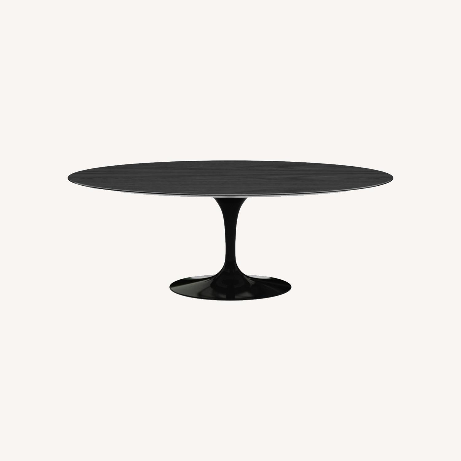 Seller's Notes:This authentic Knoll Saarinen Table is an iconic, masterful creation from world-renowned Finnish designer Eero Saarinen and comes with a sturdy, cast-aluminum black base and black solid wood veneer top. Seats 6-8. MATERIALS: Molded cast aluminum // Laminate, wood veneer