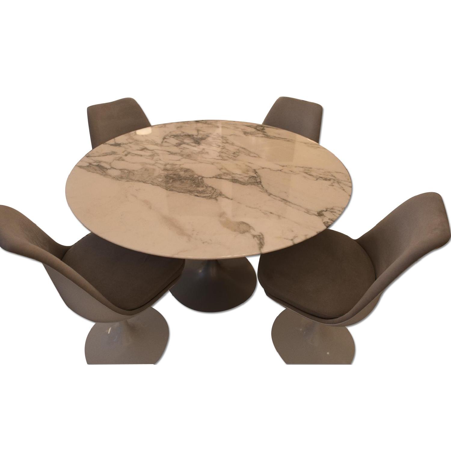Seller's Notes:This authentic Knoll Saarinen Dining set won't fit well in our new apartment. Quite disappointing. The set includes an Arabescato marble top with a polished finish and a Platinum based. The 4 chairs are fully upholstered (this isn't common, but man are they comfortable) in grey ultrasuede fabric. We're sad to see them go.