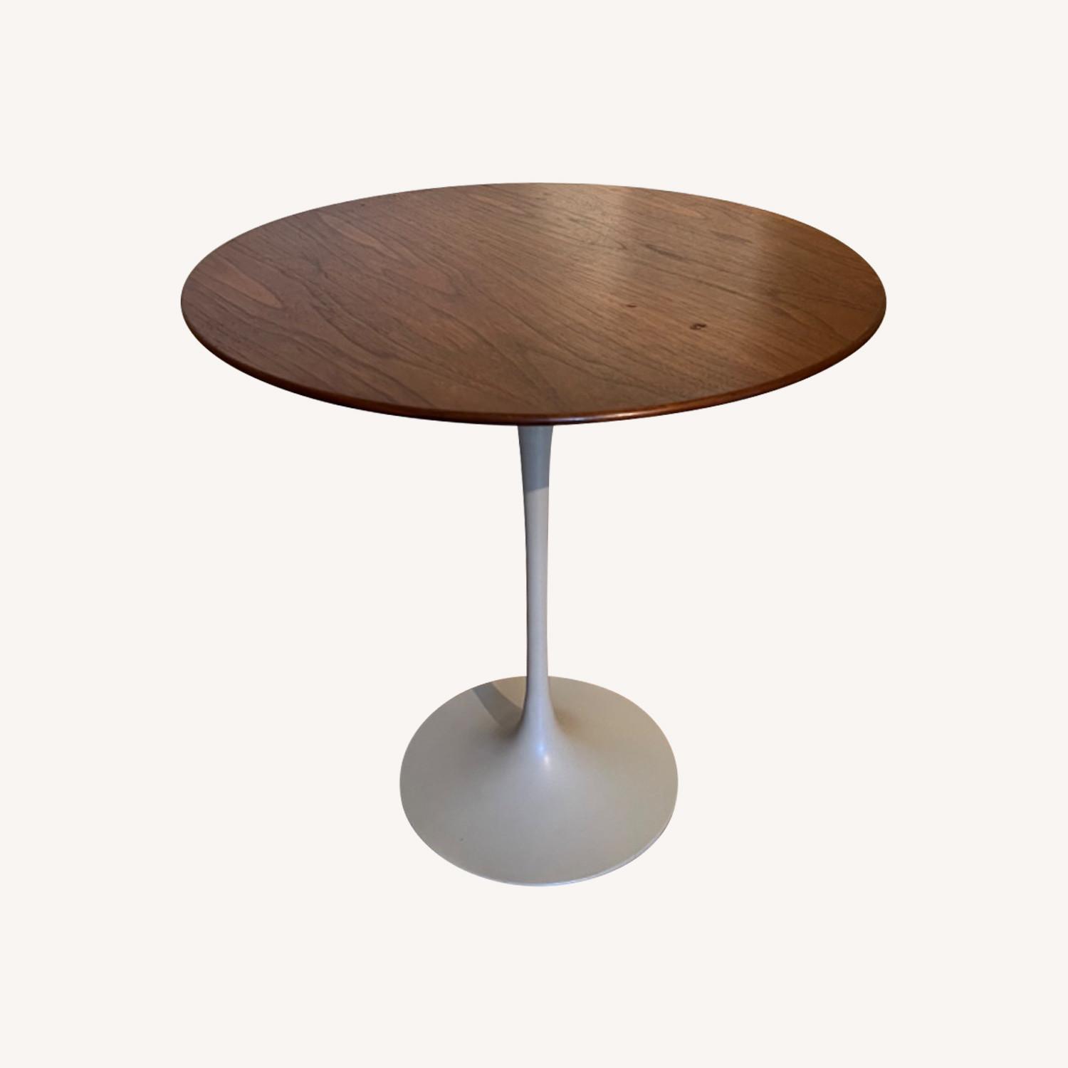 Seller's Notes:Vintage Saarinen side table in good condition. Original label on table top, metal base (heavy) is beige and table top is original walnut veneer. Table top has some light scratches and liquid spots. There is a dark blemish on table base near table top, pictured but not visible in use. Table is 20” tall and wide.