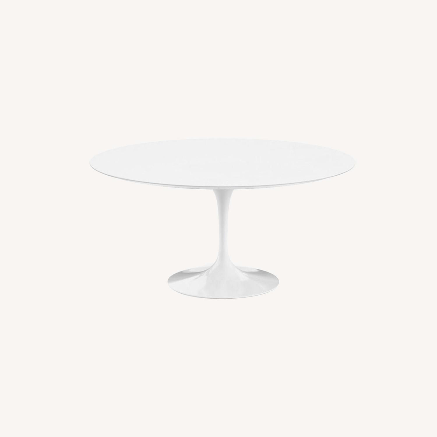 Seller's Notes:In his purist approach to design, Finnish-born Eero Saarinen sought out the essential idea and reduced it to the most effective structural solution. "The underside of typical chairs and tables makes a confusing, unrestful world," explained Saarinen. "I wanted to clear up the slum of legs." In his pedestal collection, which includes a dining, coffee and side table, Saarinen realized his ideal of formal unity: "Every significant piece of furniture has a holistic structure." Winner of the 1969 Museum of Modern Art Award. Construction notes: Base is constructed from molded cast aluminum polished and coated in tough, abrasion-resistant rilsan finish in white. Laminate top: offered in white is an exceptionally durable plastic surface. Highly resistant, smooth satin surface, the finish resists fingerprints making it smooth, durable, and easy to maintain. 1.06" bevel-edged satin smooth laminate. The table is in very good condition, except for a small dent on the laminate top which is about 2mm long (see pictures).