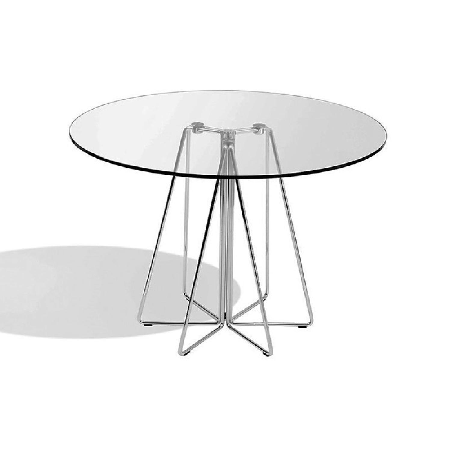 Seller's Notes:I'm selling this beautiful, contemporary table because it is slightly too big for my current apartment (It is 48" in diameter). The table top shows minor scratches from normal wear and tear and there is a tiny chip on the rim of the glass. One of the brackets attaching the top to the base has been replaced from the original as well. Overall, the table is in great shape and looks beautiful. Please note that the second and third pictures are stock photos.