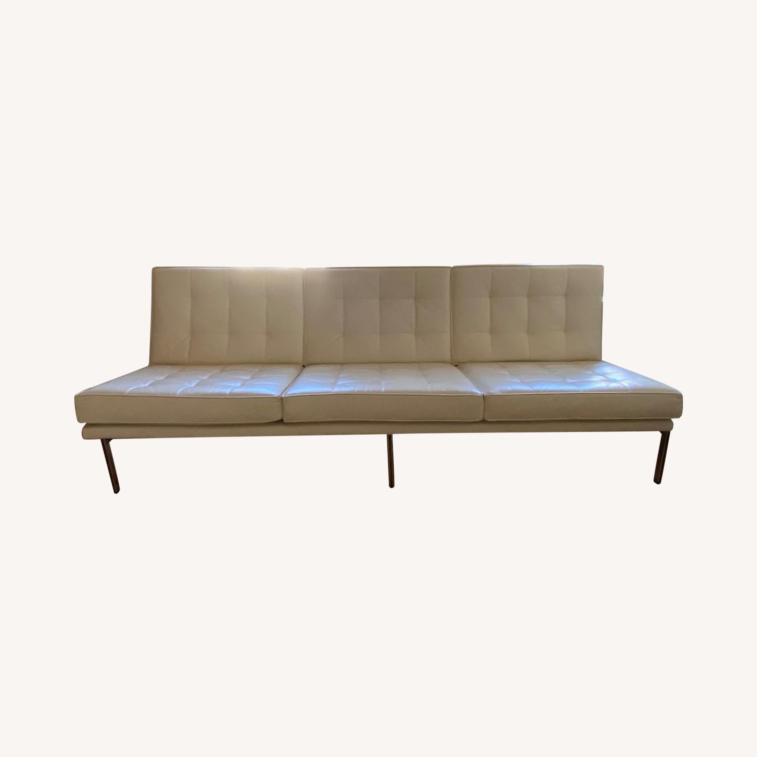 Seller's Notes:I have to depart from my lovely couch that I got reupholstered 2 years ago. It's a vintage knoll (no label since reupholstered) that originally had fabric falling apart but the structure was still very good. The chrome frame can be removed to move easily. The leather is a warm white and can be easily cleaned and maintained. It's unfortunately too big for my current apartment. The foam is rather firm so the couch keeps its nice shape.